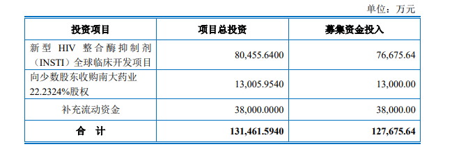 扣除发行费用后将用于新型HIV整合酶抑制剂全球临床开发项目、向少数股东收购南大药业22.2324%股权及补充流动资金。