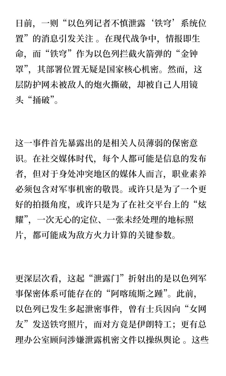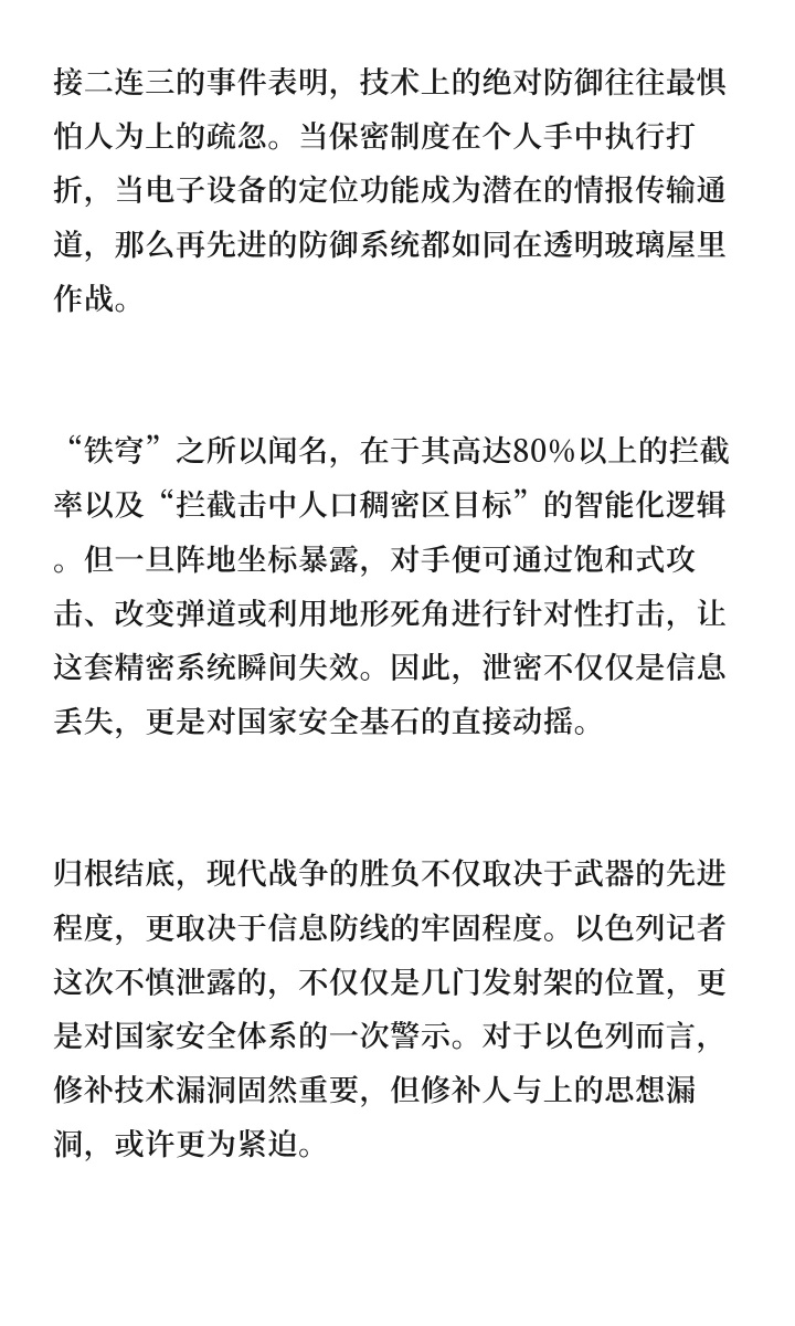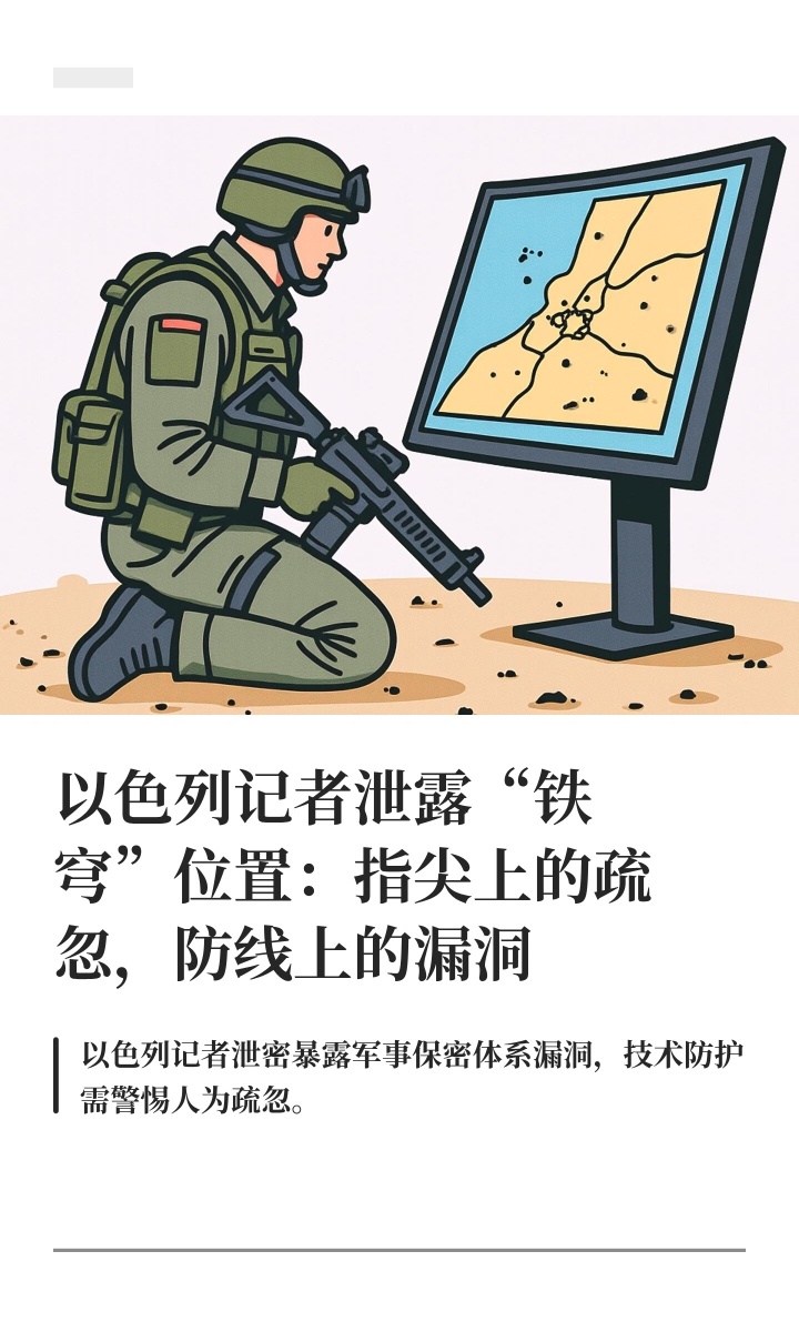 更深层次看,这起“泄露门”折射出的是以色列军事保密体系可能存在的“阿喀琉斯之踵”。此前,以色列已发生多起泄密事件,曾有士兵因向“女网友”发送铁穹照片,而对方竟是伊朗特工;更有总理办公室顾问涉嫌泄露机密文件以操纵舆论 。这些接二连三的事件表明,技术上的绝对防御往往最惧怕人为上的疏忽。当保密制度在个人手中执行打折,当电子设备的定位功能成为潜在的情报传输通道,那么再先进的防御系统都如同在透明玻璃屋里作战。