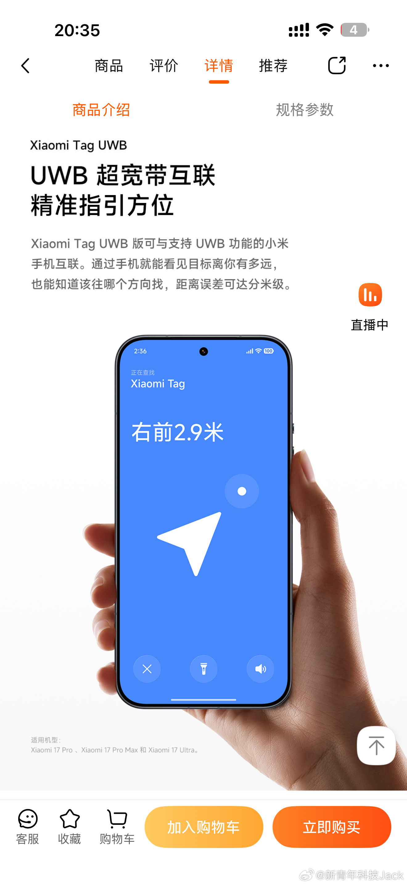 小米Tag蓝牙版,69元小米Tag UWB版,129元支持苹果Find My协议内置高音量蜂鸣器,CR2032电池供电续航时间约为1年,IP67防尘防水UWB版本需要手机支持UWB (小米17Pro和Ultra 系列)