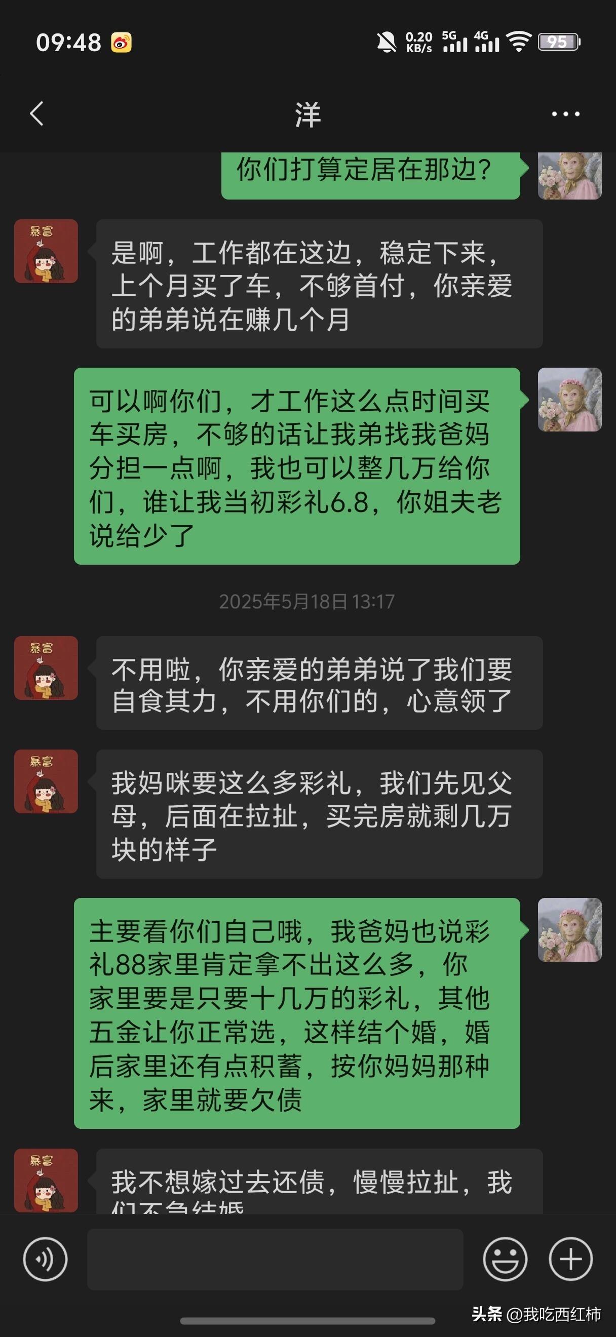关于88万彩礼➕100克黄金➕10万恩养费 听过离谱的,没听过这么离谱的地方,当事人跟我弟都是继续谈的态度,女孩子真的还是不错的,毕竟从校园到现在10年了要,只能说在一个不开明的家庭,心有余而力不足 澄清一下,最后面有个截图,真不是阴阳,人家就是喜欢说“亲爱的”从一开始加好友就是这样说的,而且每天都聊天的,当闺蜜处,各种聊的,还有房子他俩是说清楚了的,房子目前只有我弟的名字,房贷我弟一个人负责,如果分开11w加利息还给女生,如果结婚,婚房加名字,或者过户给女生我弟都愿意的,还有人质疑我上一篇为什么群里发个信息亲戚会借几万,因为都是我奶奶生的啊,生了11个,基本都当爷爷奶奶了,肯定人就多啊。别看69个人,其实只有11家,都不是外人,肯定会借啊