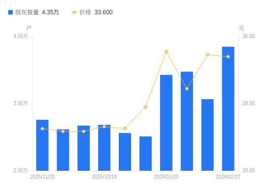 日期A股户数(户)流通A股户均持股数(股)户均持股市值(万元)2026-02-133565825133.5285.032026-01-313975922541.0967.132026-01-203929022810.1678.012026-01-093011029764.5782.212025-12-313062829261.1773.272025-12-193183928148.0771.072025-12-103173528240.3169.732025-11-283116528756.8270.972025-11-203259427496.0568.802025-11-103845423305.9363.39