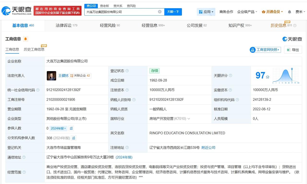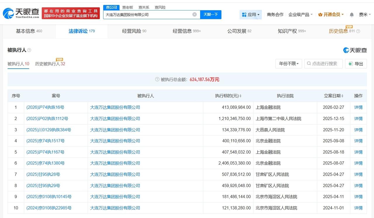万达集团等被恢复执行4.1亿 王健林名下公司被恢复执行4.1亿 天眼查法律诉讼信息显示,近日,大连万达集团股份有限公司、万达地产集团有限公司等新增1条恢复执行信息,执行标的4.1亿余元,执行法院为上海金融法院。 大连万达集团股份有限公司成立于1992年9月,法定代表人为王健林,注册资本10亿人民币,经营范围包括商业地产投资及经营、酒店建设投资及经营、连锁百货投资及经营、电影院线等文化产业投资及经营等。股东信息显示,该公司由大连合兴投资有限公司、王健林共同持股。天眼风险信息显示,该公司现存10条被执行人信息,被执行总金额超62亿元。 天眼查信息: