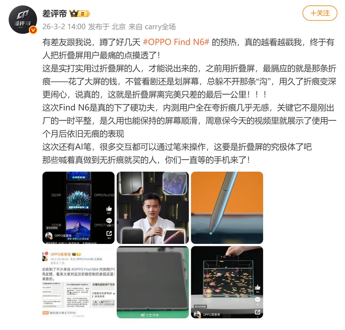 OPPO Find N6出圈了!折叠屏多年之痛被干碎,防水平整双封神 近期 ,OPPO 周意保在微博放出重磅炸弹:Find N6 直接亮出IP56/IP58/IP59 三重满级防水,看得见的硬核防护,把折叠屏可靠性拉到新高度。从行业视角看,折叠屏早已解决轻薄、性能、续航、耐用性等基础问题,唯独折痕,一直是距离完美体验的最后一公里。 这次 Find N6 给出明确答案:久用依然平整。实际体验更直观,不管视觉还是触感,屏幕都“一马平川”,用了一个月几乎看不见折痕,观感和手感双双惊艳,彻底打破 “折叠屏必有痕” 的固有印象。 说实话,从产品竞争力来看,满级防水+极致平整,直接构筑技术壁垒,成为高端折叠屏的体验与价值天花板。搭配即将登场的AI 手写笔,大屏书写、批注、创作、跨端协作都更顺滑高效,办公与创作体验直接拉满。可靠、平整、好用,这才是高端折叠屏该有的样子。 OPPO Find N6