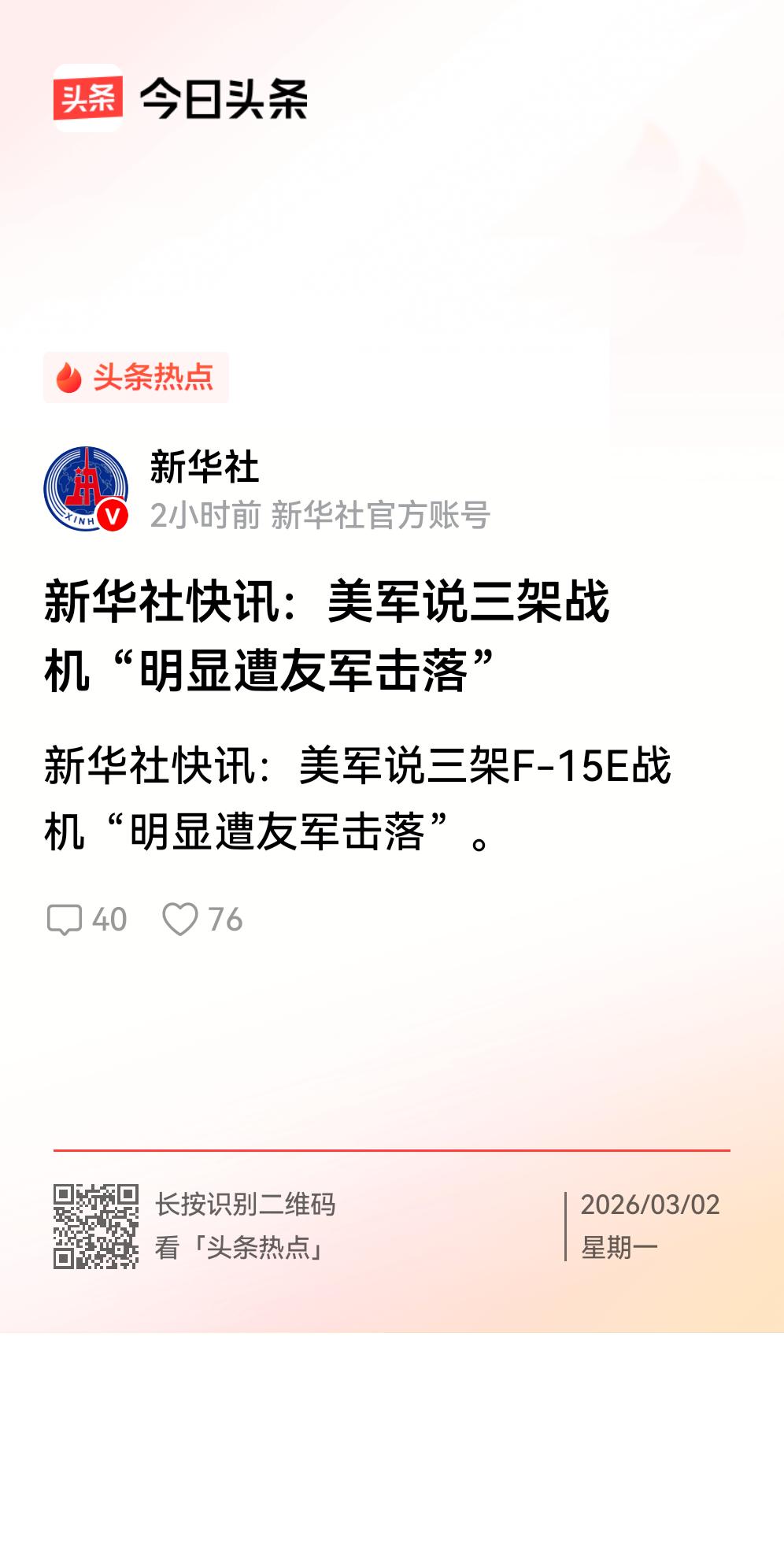 被友军打下三架战机,伊朗成了美国友军? 美以对伊朗发动袭击后,伊朗奋起反击,并宣布击落三架美军F-15E战斗机。不过,美国对此回应说,三架战机是被友军击落的。 呵呵,难道说伊朗成了美国的友军了?