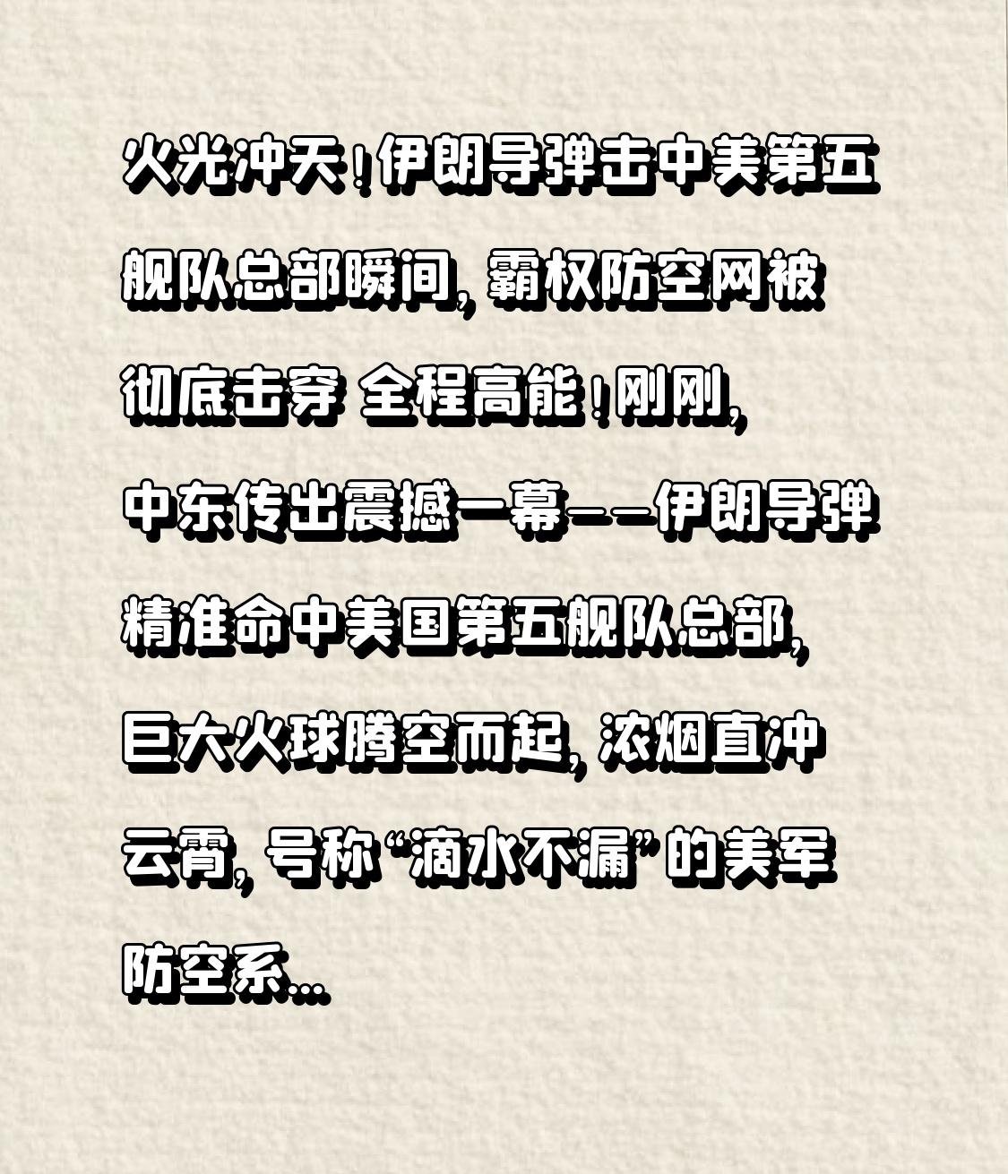 火光冲天!伊朗导弹击中美第五舰队总部瞬间,霸权防空网被彻底击穿 全程高能!刚刚,中东传出震撼一幕——伊朗导弹精准命中美国第五舰队总部,巨大火球腾空而起,浓烟直冲云霄,号称“滴水不漏”的美军防空系统,被直接撕开一道大口子! 这不是电影特效,是刚刚发生在巴林麦纳麦的真实战场。作为美国控制波斯湾的核心中枢,第五舰队总部驻扎近9000美军,配备爱国者、萨德多层反导,本以为固若金汤。可伊朗导弹呼啸而至,当场命中指挥与后勤中心,警报声响彻全城,美国驻巴林使馆直接紧急关闭。 现场画面曝光后,全网炸锅:火光、巨响、浓烟、废墟,曾经不可一世的美军基地,沦为精准打击目标,霸权神话被狠狠踩在脚下。 转折点来了! 这一击不是冲动,而是雷霆反击。此前美以联合空袭伊朗本土,造成平民与军人伤亡,伊朗忍无可忍,90分钟内迅速启动“真实承诺-4”行动,用饱和打击强势回应。 更关键的是,伊朗使用高超音速导弹,速度快、能变轨,美军反导根本拦不住。巴林官方承认遭袭,却不敢公开损失细节;伊朗直接宣告:中东所有美军目标,都是合法打击对象。 一边是肆意发动空袭、无视主权的霸权行径,一边是保家卫国、寸步不让的硬核反击。这一幕彻底打破“美军不可战胜”的谎言,也让全世界看清:靠武力横行霸道的时代,早就过去了。 网友纷纷感叹:“谁先挑事一目了然”“正义或许迟到,但绝不会缺席”“弱国无外交,强权必被反制”。 战火无情,百姓遭殃。我们不鼓吹战争,但坚决反对恃强凌弱。中东乱局一再证明:武力解决不了问题,只会带来无尽灾难。 愿战火早日熄灭,愿平民远离伤亡,愿公平与正义取代霸权与强权。这一击,打在基地,更打在霸权的脸上! 支持公道、反对战争的,点赞转发,让和平之声传遍世界!
