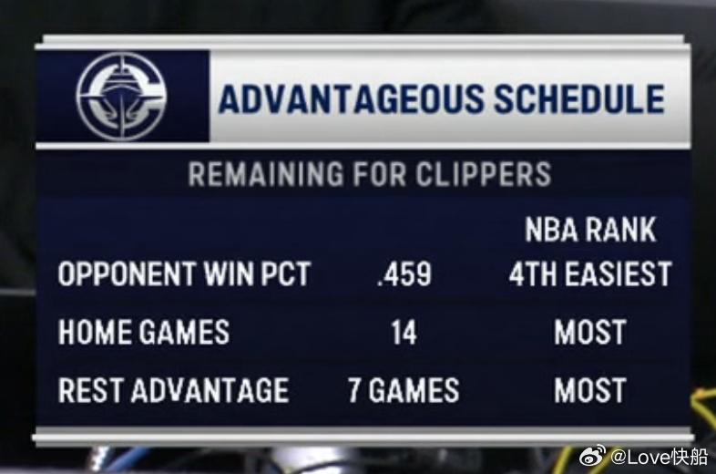 洛杉矶快船队接下来的赛程如下:• 剩余赛程难度全联盟第4轻松,对手胜率仅为 45