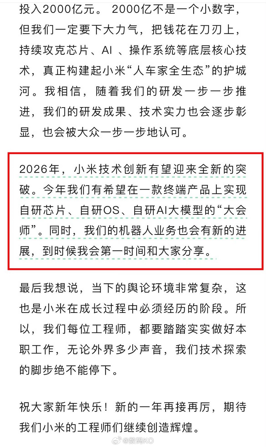 之前雷总说的小米会在一个终端产品上实现自研芯片、自研OS、自研AI大模型会师,今天卢总回答了这个问题,就是小米今年即将发布全新的机器人产品。目前小米人形机器人已经有两台在小米汽车产线上工作了,未来五年,人形机器人将大规模进入到小米产线工作。之前看小米家电定位黑灯工厂就很震撼了,这以后直接升级成机器人了,场面会更震撼。从这几天的密集爆料来看,小米又是概念跑车,又是人形机器人,真是在技术储备上更加完善了。目前比较火的领域,汽车、芯片、AI大模型、人形机器人,可以说拥有这么广的涉足,小米绝对是全球仅此一家。当然我们看到的一切,这也仅仅是小米的开始,不要忘记了小米在未来五年的研发投入2000亿,不敢想象以后的技术大爆发,那个时候的小米该有多强。永远相信美好的事情即将发生,等待真正具象化的那一天,真正的全能体的小米来临。