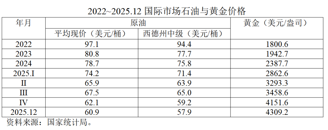 2022~2024年,国际市场原油平均现价依次为97.1美元/桶、80.8美元/桶、78.7美元/桶;2025年一至四季度,国际市场原油平均现价依次为74.2美元/桶、65.9美元/桶、67.5美元/桶和62.1美元/桶,2025年12月平均现价为60.9美元/桶。2022~2025年,油价持续下行趋势明显。