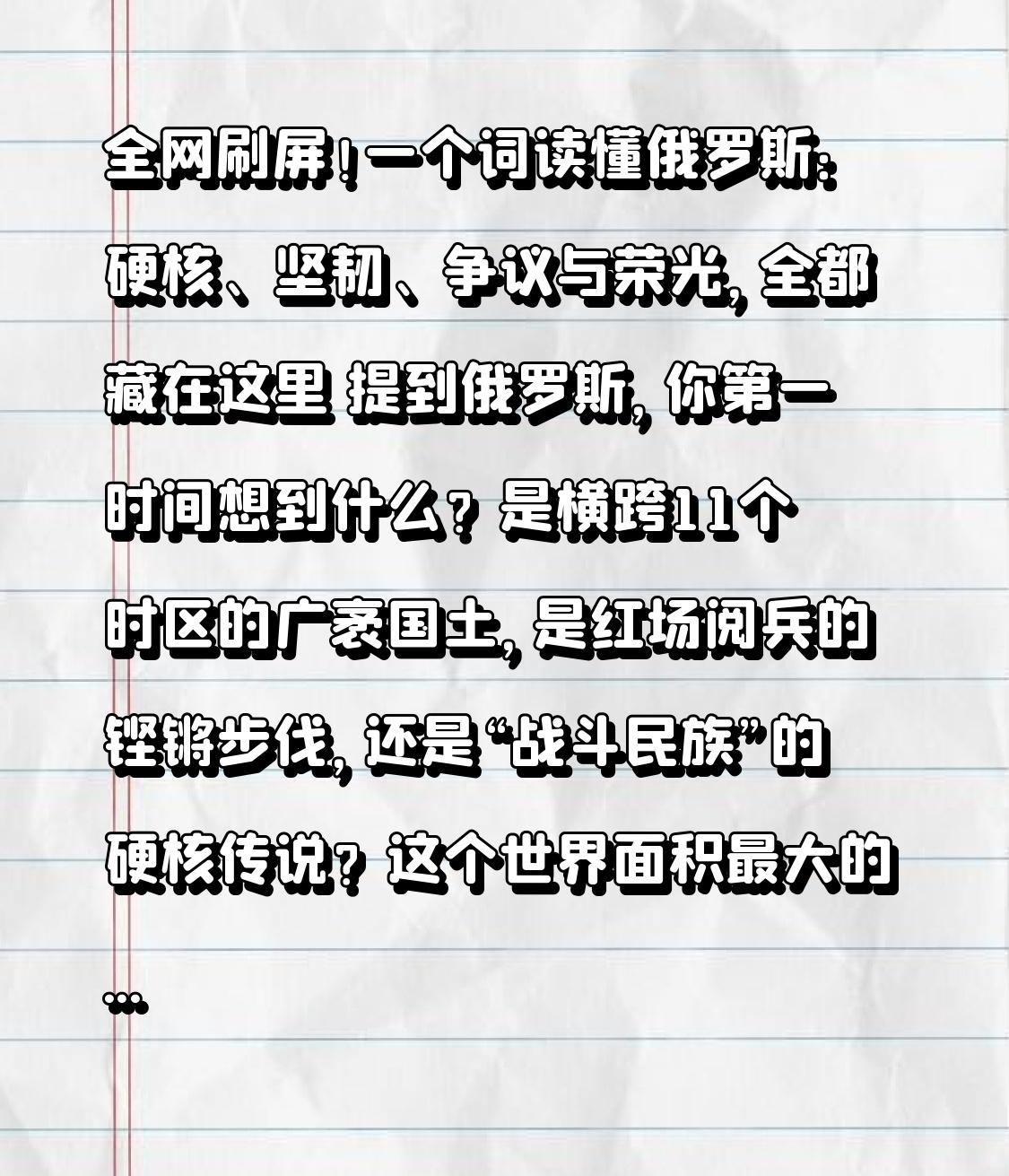 全网刷屏!一个词读懂俄罗斯:硬核、坚韧、争议与荣光,全都藏在这里 提到俄罗斯,你第一时间想到什么?是横跨11个时区的广袤国土,是红场阅兵的铿锵步伐,还是“战斗民族”的硬核传说?这个世界面积最大的国家,一边站在国际博弈前沿,一边守着千年文明底蕴,一举一动都牵动全球目光。 它有着令人望而生畏的硬实力:全球第一的天然气储量、顶尖的核力量与航天技术,军工体系完整,面对重重制裁,依旧能保持战略底气。莫斯科的古典建筑与贝加尔湖的蓝冰,柴可夫斯基的旋律与托尔斯泰的文字,让它兼具铁血与浪漫,冷冽又深情。 可光环背后,是常人看不见的压力。俄乌冲突已持续上千天,本土接连遭遇袭击,能源与经济结构单一,民生与安全双重承压。最近莫斯科发生炸弹袭击、警察殉职,黑海油港遇袭、军工设施遭打击,内外部挑战接踵而至,这个大国正处在风口浪尖。 转折点来了! 很多人只看到它的强硬,却忽略了它的坚守与担当。在中东战火蔓延、局势濒临失控时,俄罗斯主动与多国通话,和中国站在一起,呼吁立即停火、重返外交谈判,反对丛林法则,守护国际法底线。 它不回避冲突,也不放弃和平;面对围堵不低头,面对危难不退缩,把“民族韧性”刻进骨子里。外界唱衰、制裁加码、战场消耗,都没让它垮掉,反而在逆境中越挫越勇。 网友纷纷感叹:这才是真正的大国模样,有锋芒,也有温度;有争议,更有立场。没有哪个国家容易,光鲜背后,都是负重前行。 我们不站队地缘博弈,只尊重每一个为和平努力、为民生坚守的国家。俄罗斯的故事告诉世界:真正的强大,不是永远不受伤,而是受伤之后依然能站起来;真正的底气,不是咄咄逼人,而是在混乱中守住原则,在风雨中护佑国民。 从红场到边疆,从文学到战场,从对抗到对话,俄罗斯的复杂与真实,远超标签与传闻。 愿硝烟早日散去,愿安稳重回大地,愿每个国家都能被世界温柔以待,愿和平成为这片土地最长久的荣光。 想更深入了解俄罗斯的当下与未来,点赞关注,下期继续拆解!