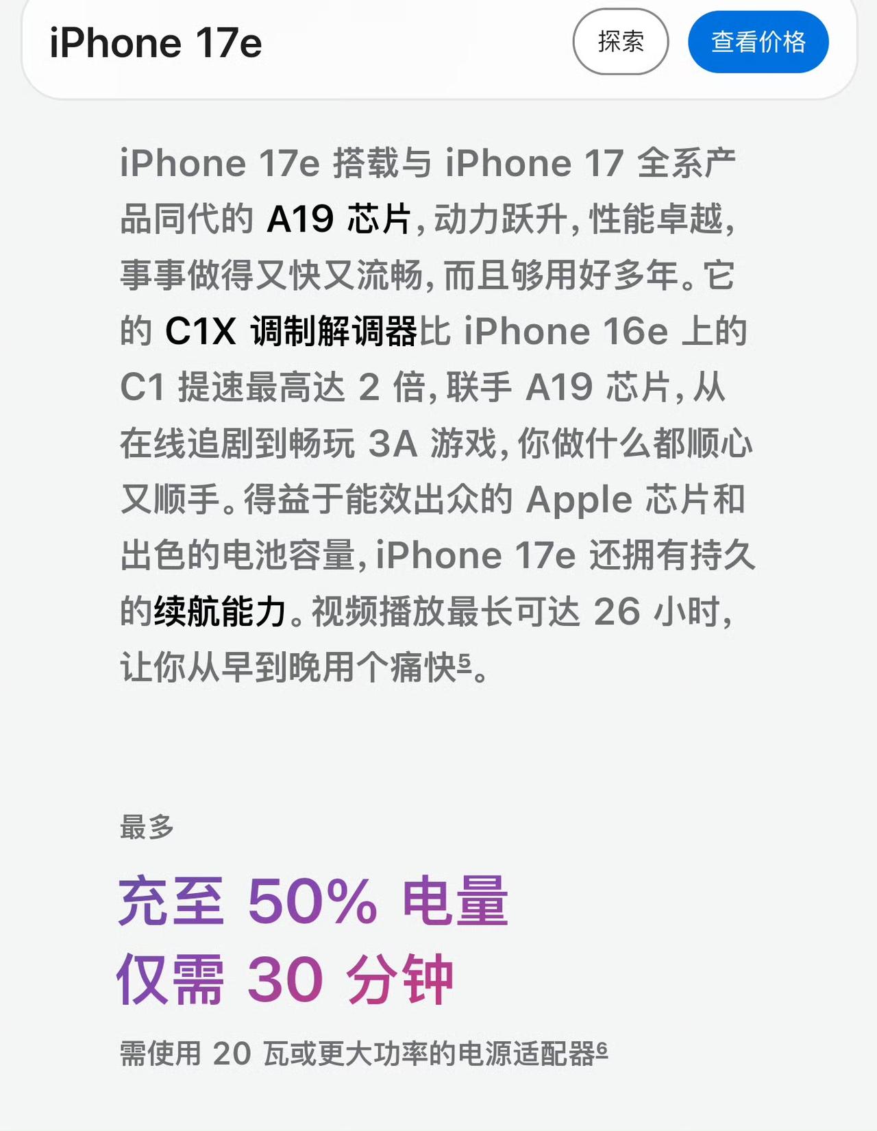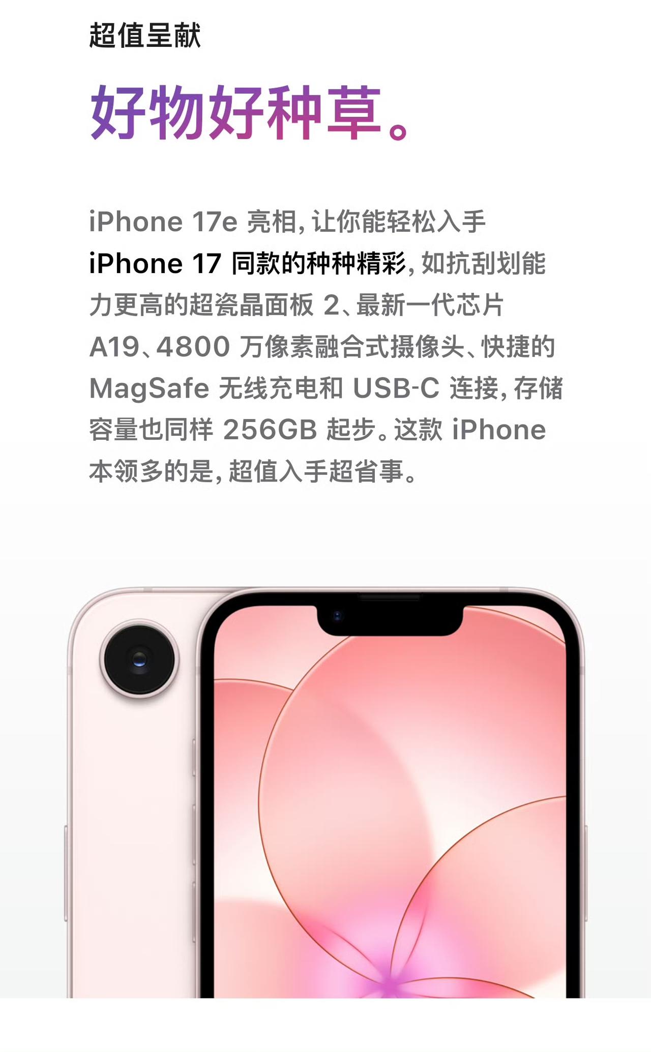 4499元起,iPhone17e发布,A19芯片,内存256GB起 8+256GB:4499元 8+512GB:6499元 核心配置如下: ---A19处理器(6核CPU+4核GPU),相比17标准版少一个GPU ---6.1英寸刘海儿屏幕,60Hz刷新率,分辨率2532*1170 ---后置48MP主摄,前置12MP镜头 ---支持 15W MagSafe 磁吸充电,搭载C1X自研基带 ---厚7.8mm,重170g,铝金属中框 ---支持NFC,n79频段、IP68防尘防水、 单实体卡槽同时支持双eSIM 如果能叠加国补,相当于3999元买个256GB最新款苹果手机,在内存暴涨的背景下,这价格还是挺香的。这代还支持了MagSafe,唯一槽点就是60Hz刘海儿屏。