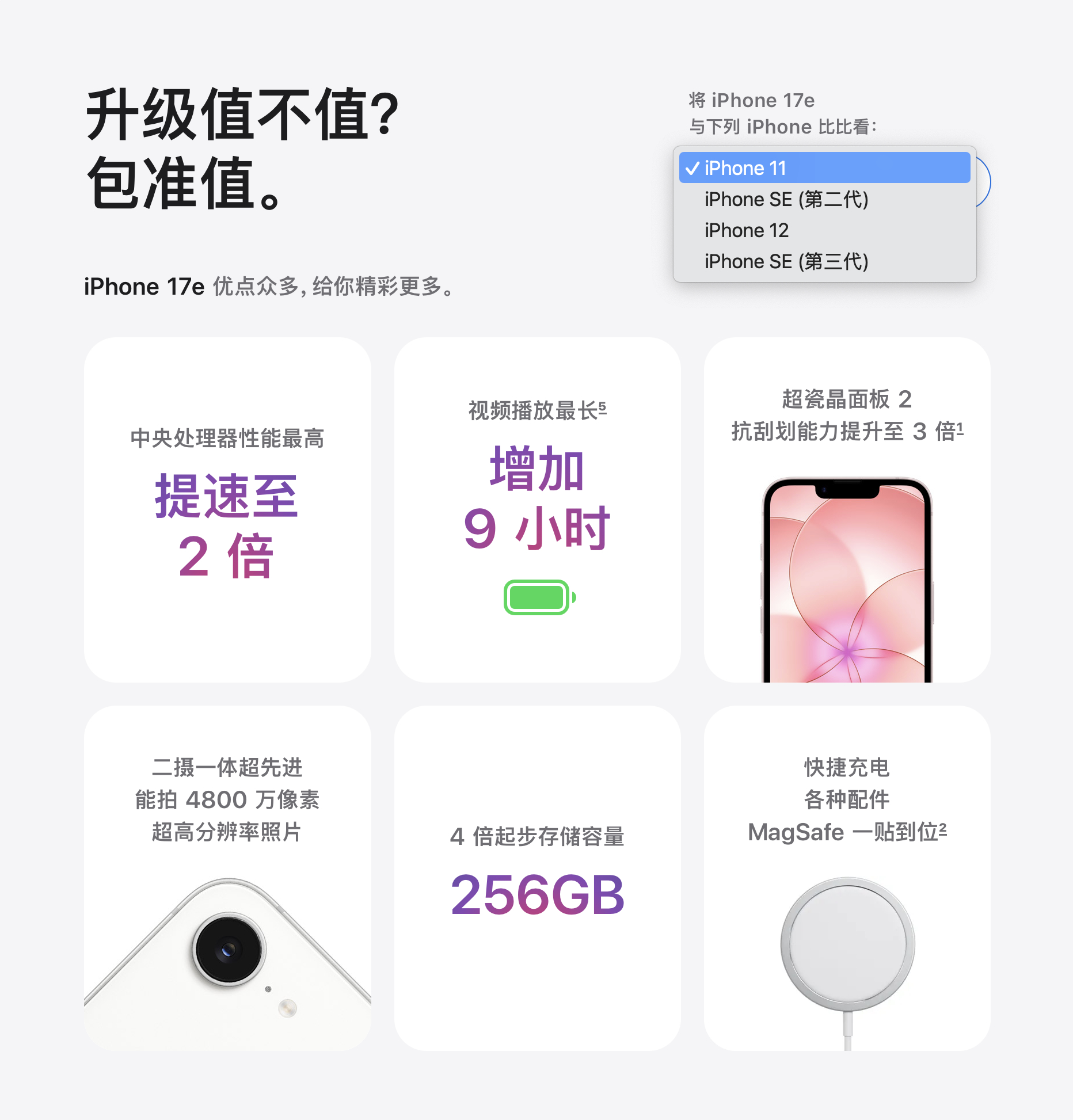 官网的机型比较显示了苹果心目中的目标用户,标注的是 iPhone 11、iPhone SE 2、iPhone 12、iPhone SE 3 这四款机型。