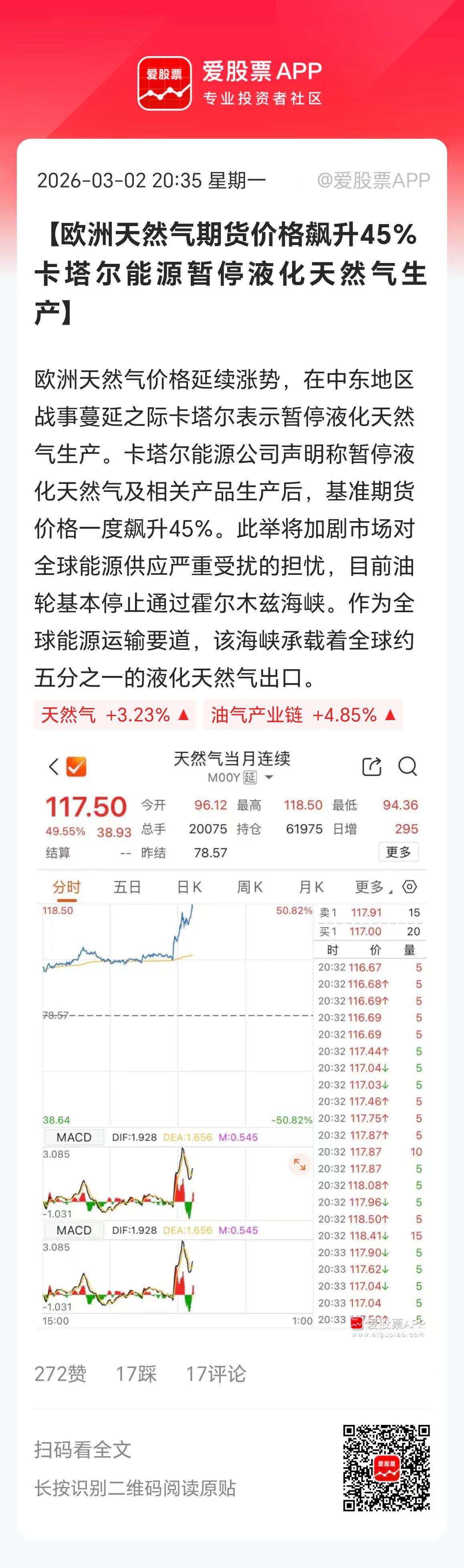 受卡塔尔液化天然气项目暂停影响,欧洲天然气价格飙涨幅45%。今天A股天然气板块20多家涨停,明天这又是火上加油了。 天然气是非常多工业的原材料,牵一发而动全身。主要带来两大影响,一是替代能源的需求会有提升,二是非欧洲产能会受益。这个也利好国内新能源,以前光伏等过剩,现在想象空间又打开了! 不过,现在媒体炒作欧洲天然气价格暴涨、航运价格暴涨等消息。更多是基于霍尔木兹海峡被封锁下!一旦伊朗跟美国谈判,这两个板块都有可能迅速回落。 爱股君认为,中东局势没有那么悲观,一是以色列股市今天大涨,二是以色列预计最早今晚逐步开放其领空。说明第一波基本上结束了,第二波应该掀不起大的风浪了。