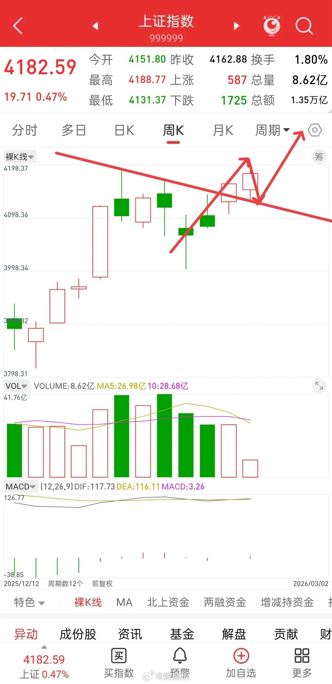先说观点,大盘目前走势良好,没有什么问题,从周K线来看,大盘上周突破4190-4170下降趋势压力,今天最低点是4131,正好完成突破后的回踩,回踩不破支撑,然后继续上攻。