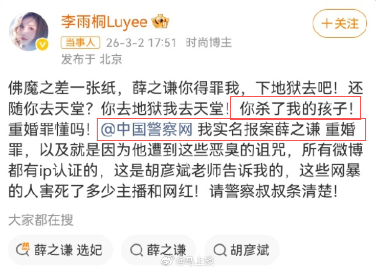 天呐,太抓马了。李雨桐爆料薛之谦有重婚罪,说薛之谦杀了她的孩子,还透露薛之谦说张