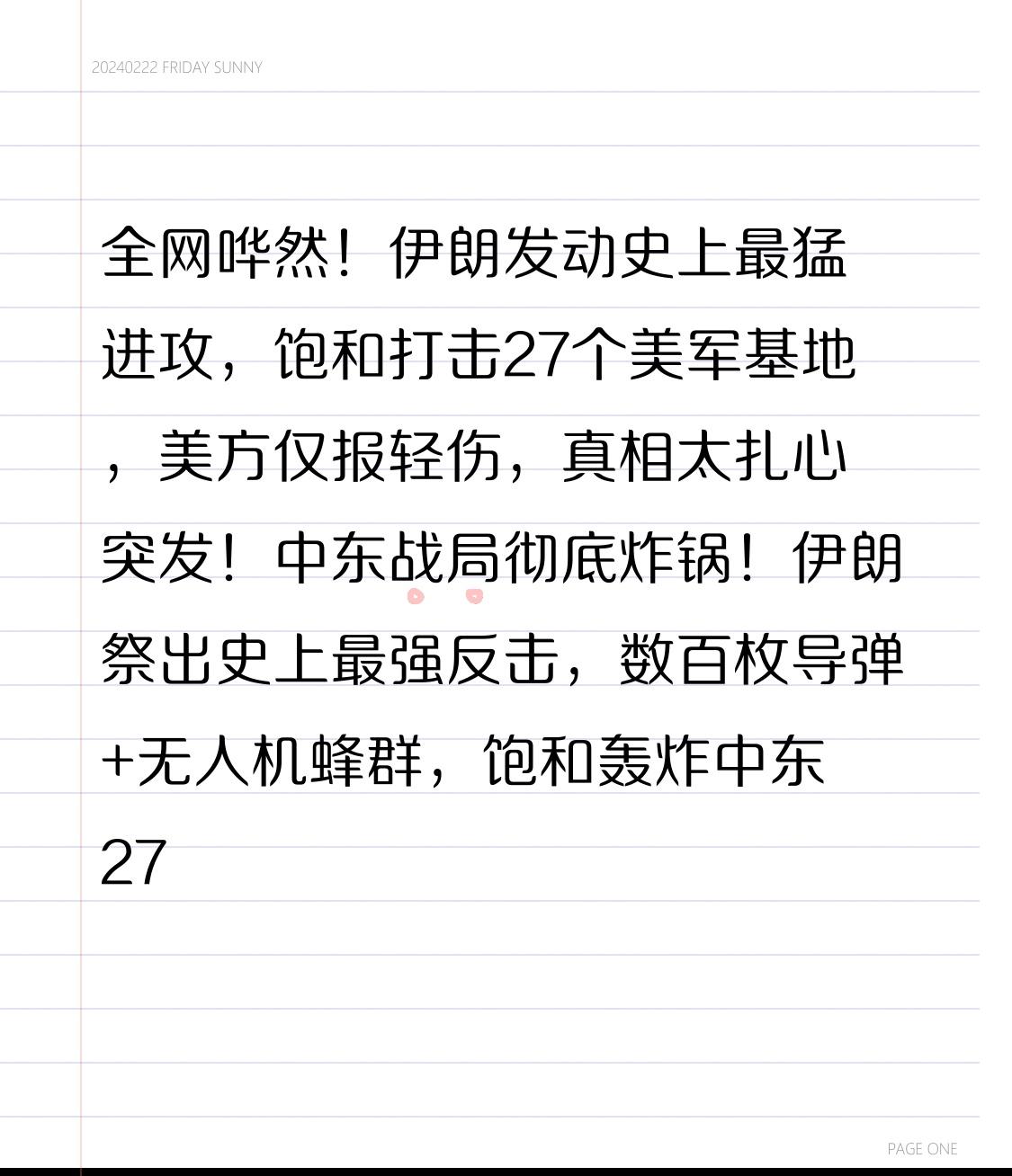 全网哗然!伊朗发动史上最猛进攻,饱和打击27个美军基地,美方仅报轻伤,真相太扎心 突发!中东战局彻底炸锅!伊朗祭出史上最强反击,数百枚导弹+无人机蜂群,饱和轰炸中东27个美军基地,火力覆盖巴林、科威特、卡塔尔等多国核心据点,本以为美军必遭重创,结果美方通报直接让全世界愣住:仅数人轻伤,核心战力毫发无损! 这波进攻有多猛?伊朗动用弹道导弹、巡航导弹、自杀式无人机,分九轮轮番打击,第五舰队总部、乌代德空军基地等全被锁定,导弹呼啸、火光冲天,现场画面堪比战争大片。伊朗宣称造成560人伤亡、多座基地瘫痪,舆论一度认为美军惨不忍睹。 转折点来了! 美军中央司令部火速辟谣,直接戳破战果泡沫:绝大多数来袭武器被爱国者、萨德成功拦截,仅有零星弹药突破防线,造成12人轻伤(多为脑震荡、皮外伤),3处设施轻微受损,无核心装备被毁,士兵简单治疗后迅速返岗,作战能力未受任何影响。 更打脸的是,第三方核查显示,美军基地无大规模伤亡痕迹,伊朗宣称击中的航母、油轮,要么未被接近,要么仅轻微划痕,所谓“毁灭性打击”,全是士气宣传。 网友瞬间吵翻:“火力拉满,伤害刮痧”“反导系统太顶了”“信息战比战场还激烈”。 这场对决暴露残酷真相:现代战争拼的不是数量,是反导、情报、体系化作战。伊朗拼尽全力的反击,在美国多层防御网面前,几乎被清零。 双方战报天差地别,伊朗夸大战果振士气,美国淡化伤亡稳民心,真实战况藏在信息迷雾里。 我们不站队、不煽火,只心疼战火下的平民。战争没有赢家,导弹再猛,炸不垮体系;口号再响,护不住民生。 愿战火早日熄灭,愿对话取代硝烟,愿中东大地重归安宁。 谴责战争、呼吁和平的,点赞转发,让世界听见普通人的心声!