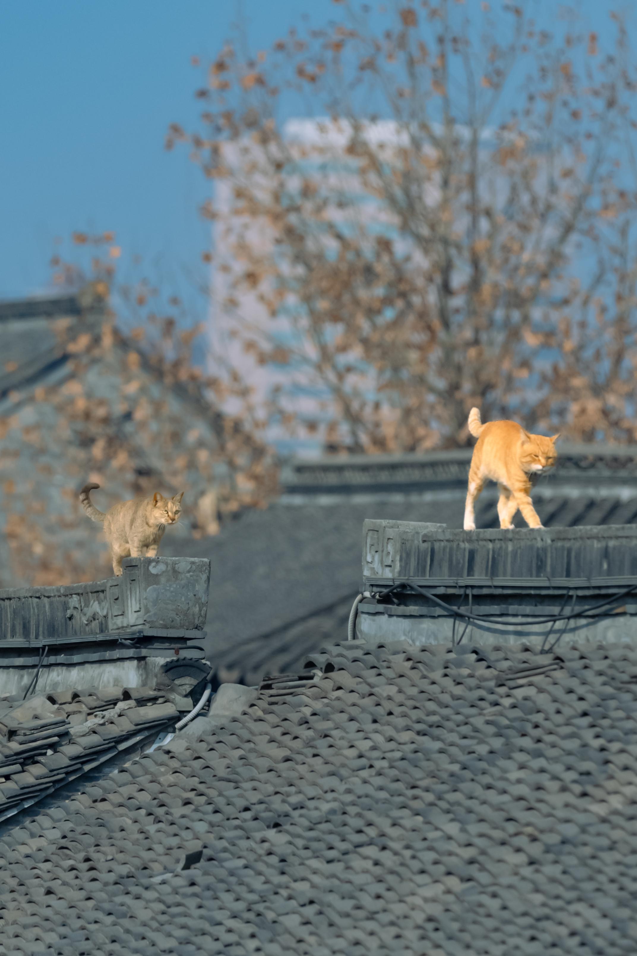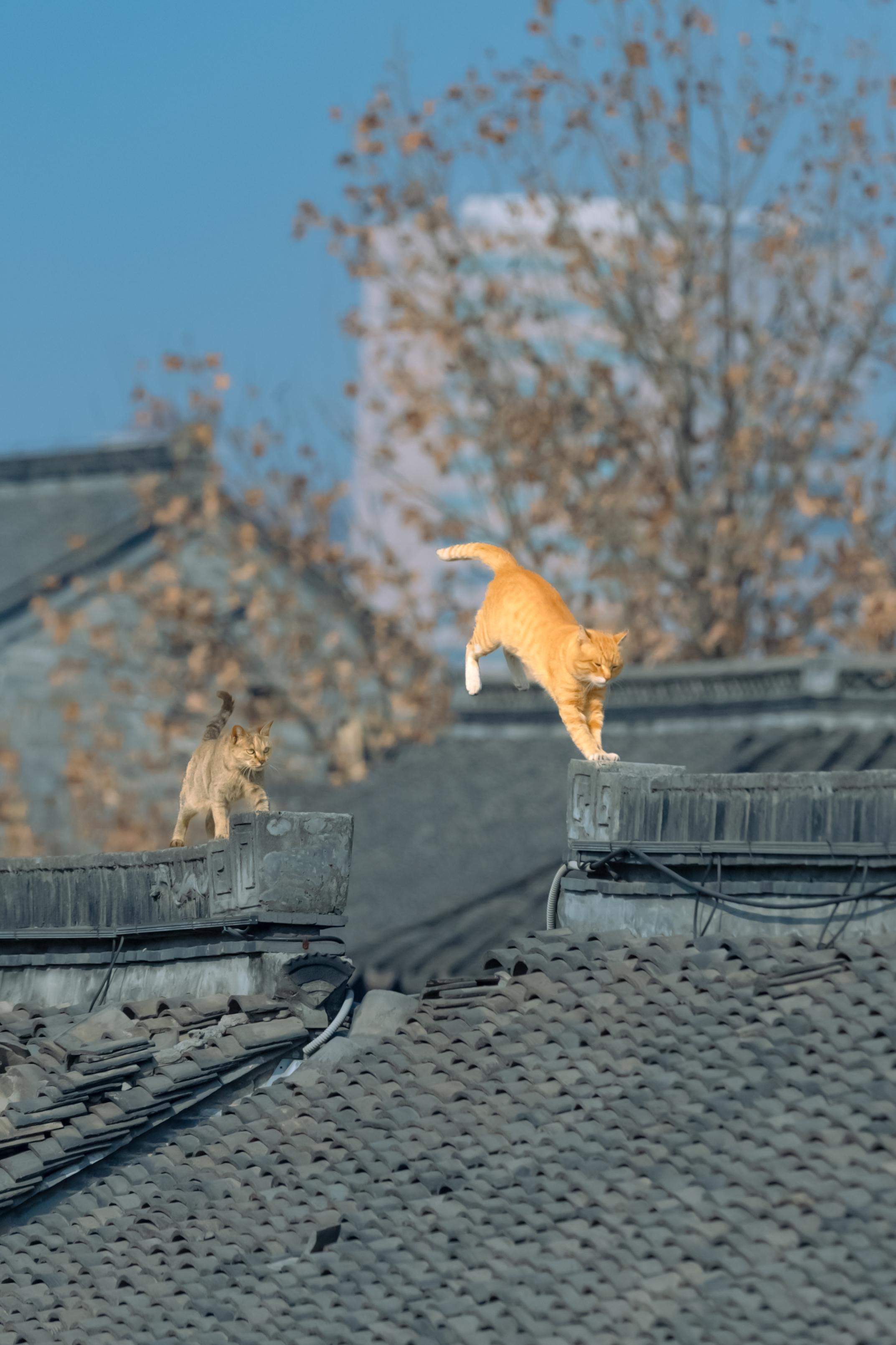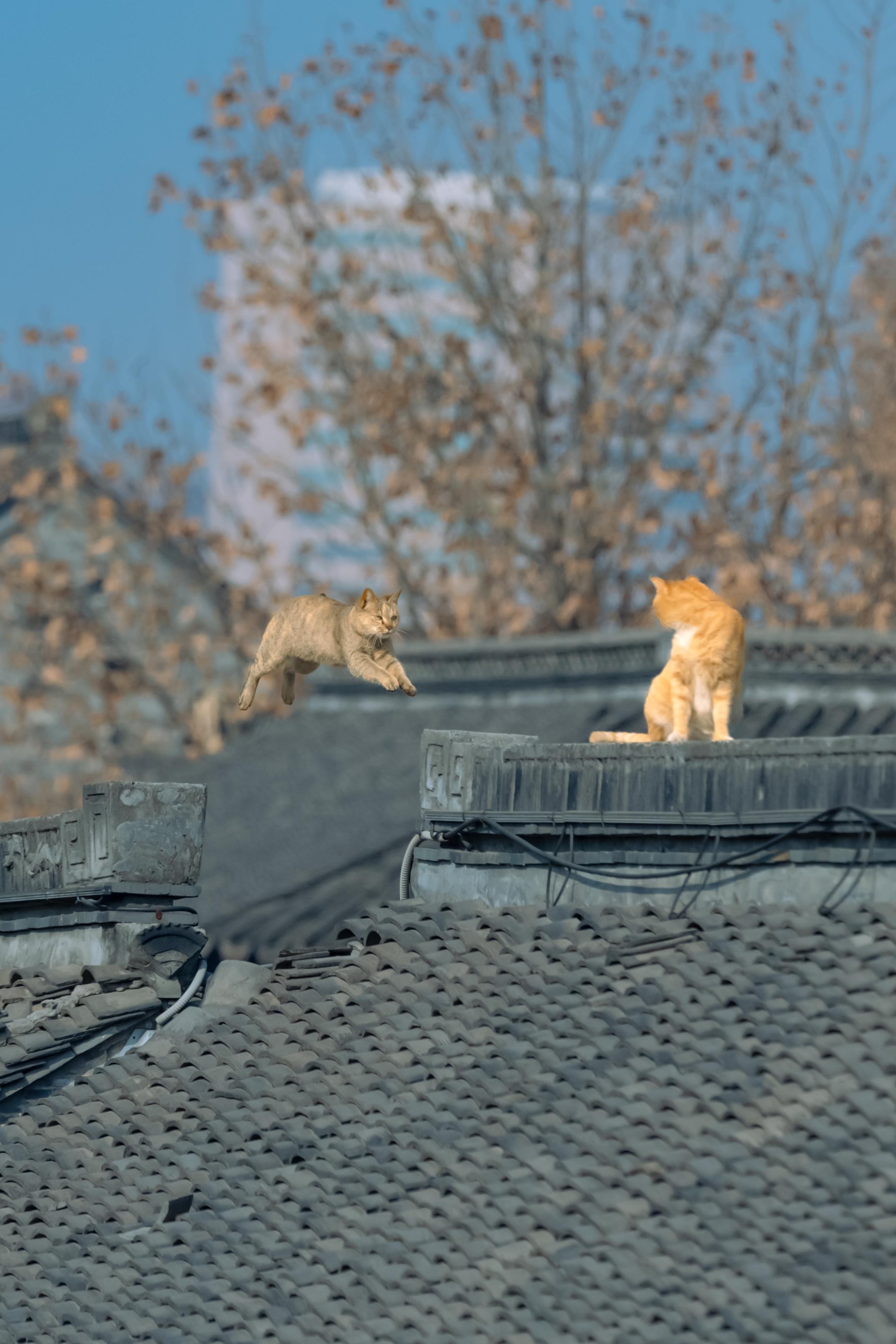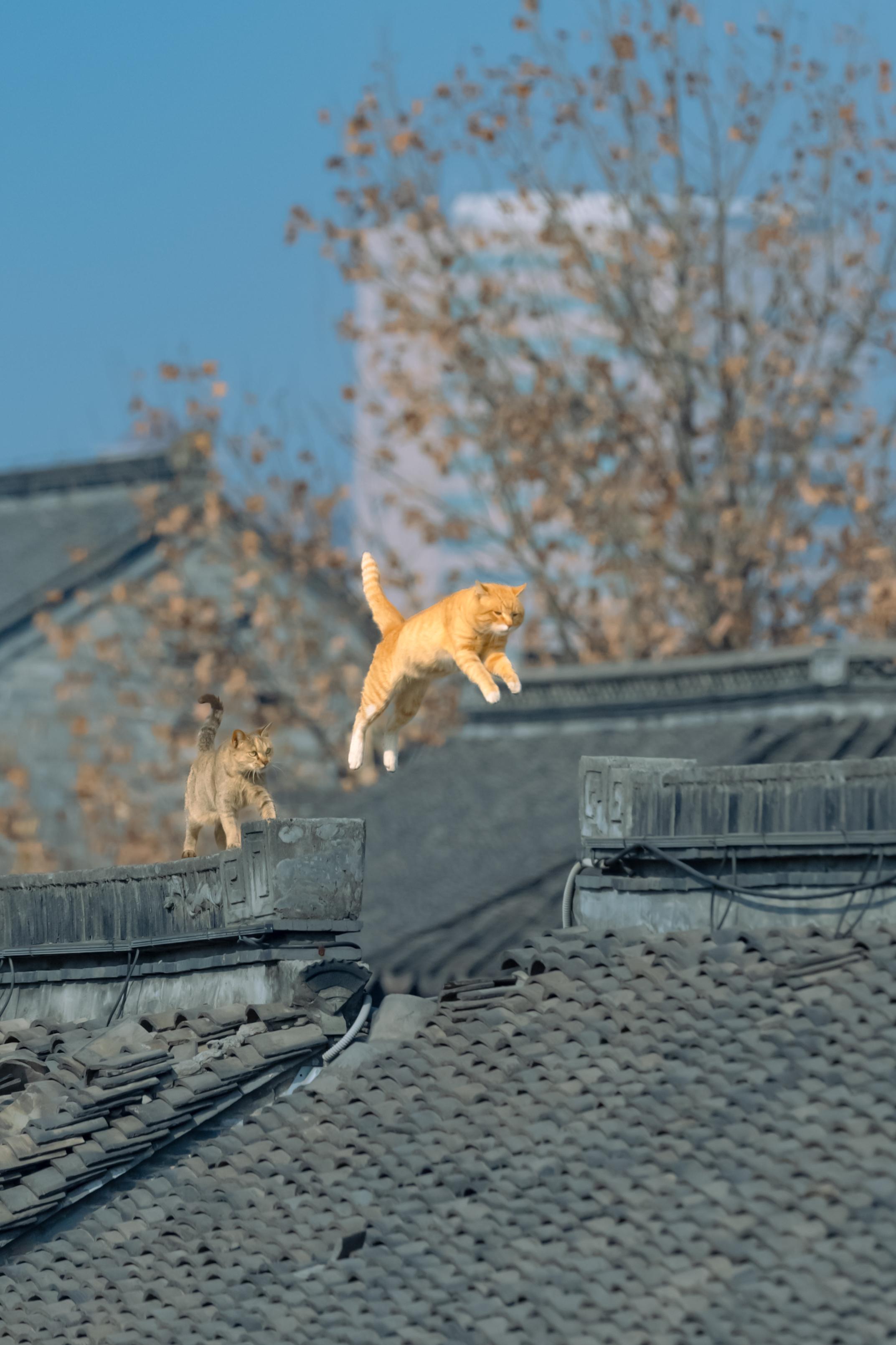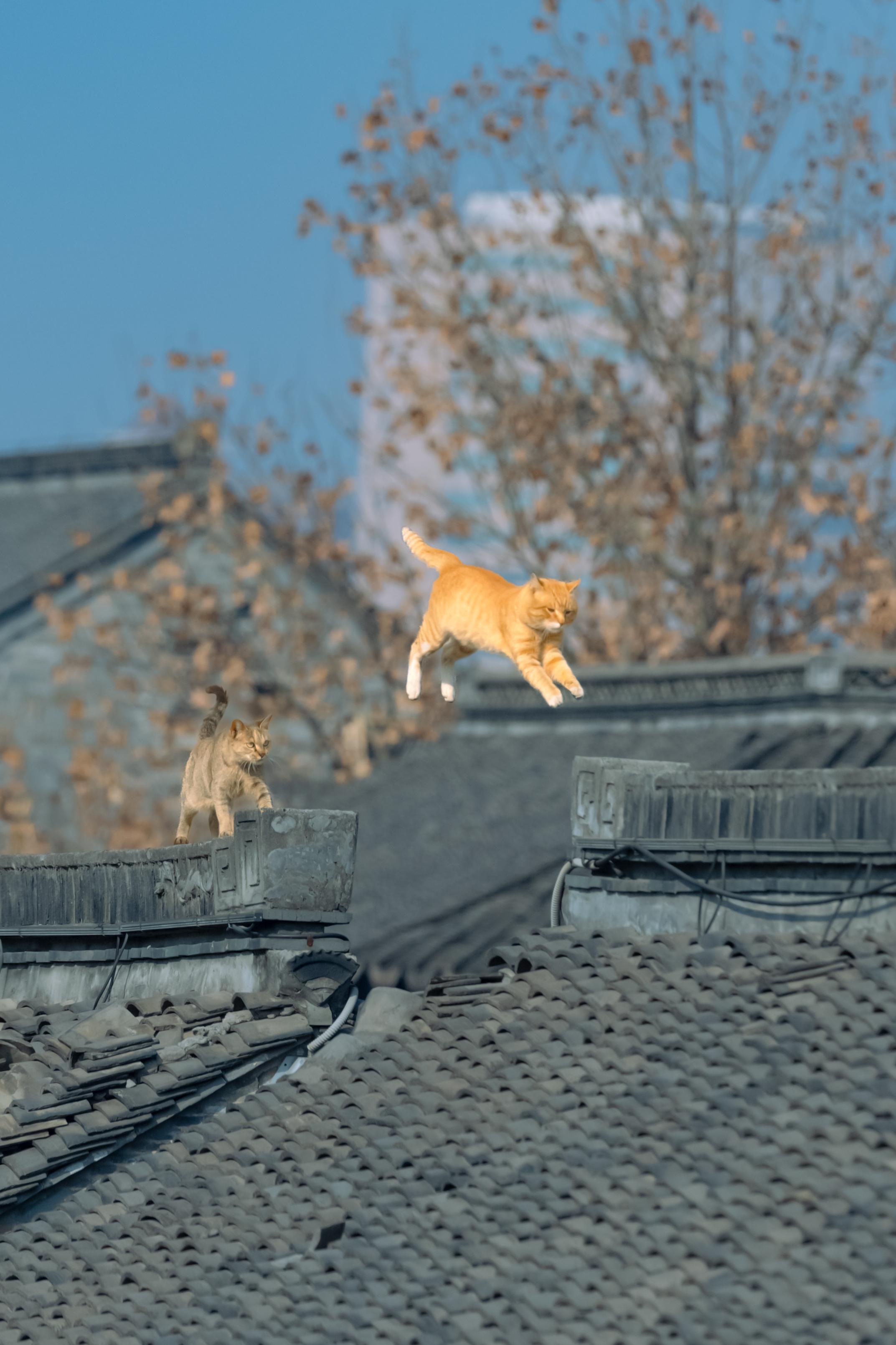 江南老街上,拍到了双猫飞跃。同一位置,同一只大橘,一月的时候拍到过单猫...