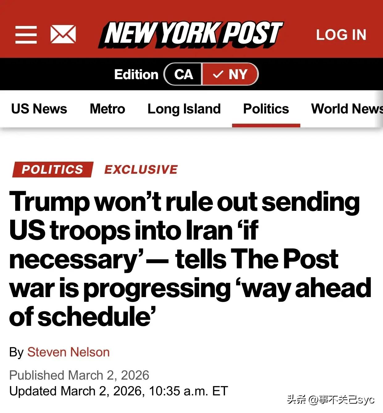 纽约邮报3月2日独家报道:特朗普不排除“如果有必要”派遣美军进入伊朗的可能性。 特朗普声言,“对于地面部队,我并不担心——好像每位总统都会说的那样,‘不会有地面部队介入’。我不会这么说”,他表示,”我会说‘可能不需要他们’(或)‘假如他们有必要的话’” 《纽约邮报》独家报道属实。美国总统特朗普在3月2日发布的采访中明确表示,不会像前任总统那样承诺“不派遣地面部队”,如果“有必要”,他会考虑派出美军进入伊朗。 特朗普称自己对派遣地面部队“没有心理阴影(the yips)”。他直言:“每个总统都说‘不会派地面部队’,我不这么说。 他强调“不在乎民意调查”,必须做“正确的事”,并坚称允许“疯狂的人”拥有核武器比引发地区冲突更糟糕。尽管路透社民调显示仅27% 美国人支持空袭,他认为存在“沉默的大多数”支持自己。 对于当前战况与伤亡,他称“大波(打击)还没来”,行动正按计划推进。自2月28日美以联合空袭导致伊朗最高领袖哈梅内伊身亡后,局势升级,美军已有4名人员死亡。不过国防部长明确,目前尚无地面部队进入伊朗。 特朗普的言论表明,美国必须胜利,目前的胶着不是他想要的结果,他有意不惜加大战争的烈度。 而这也正是以色列所希望的