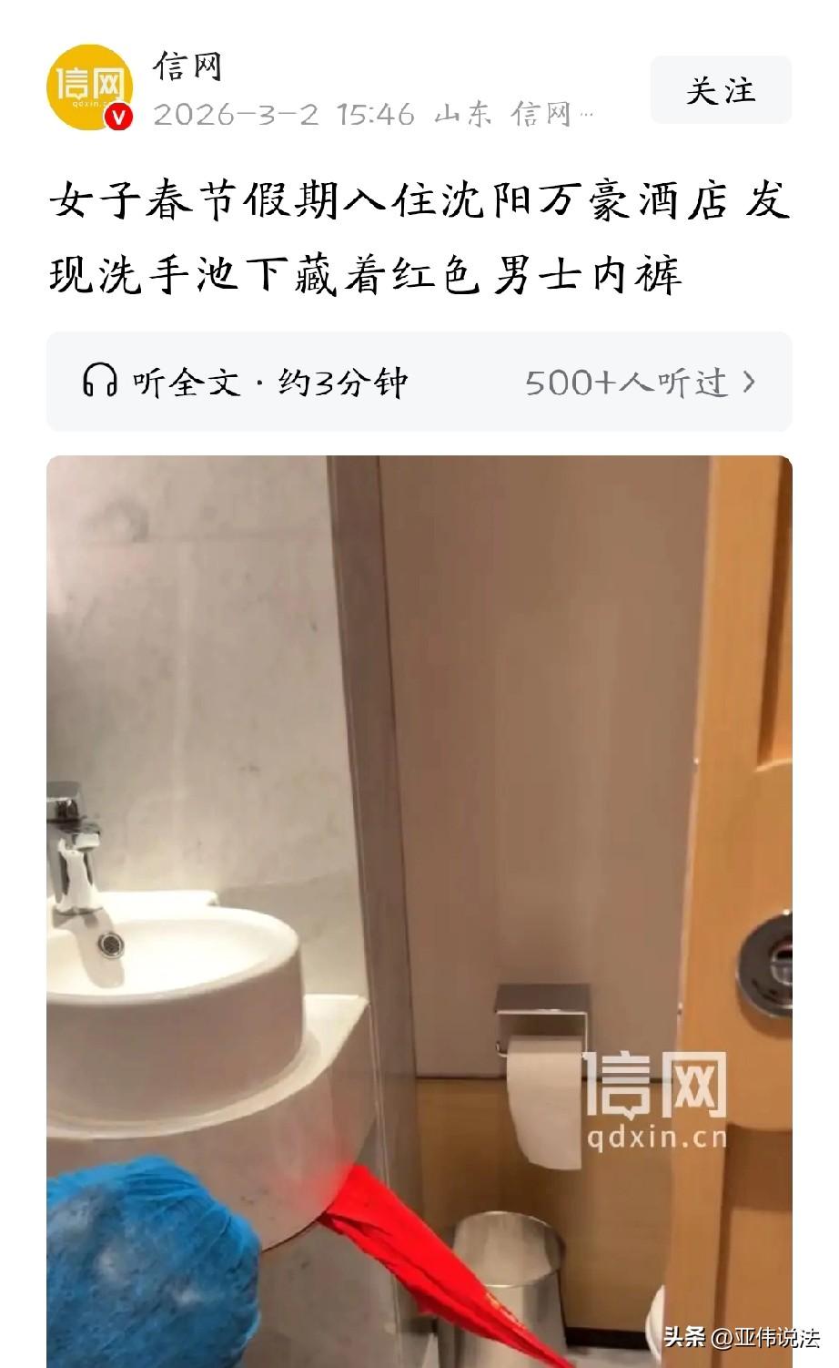 辽宁沈阳,女子出门旅游,花3000元定了一家五星级酒店,前两晚住得都很舒服,谁知最后一天晚上,她突然发现洗手盆下面塞着一团红艳艳的东西,她马上找来工作人员把东西掏出来,结果一看,竟然一条男士内裤,还是穿过的带污渍。女子顿时觉得胃里翻江倒海,游玩的心情全没了,找到酒店,要求赔偿,谁知,酒店的态度让她非常气愤。 毛女士是上海人,这次趁着春节假期和朋友一块儿来东北玩。 为了住得舒服点,她专门挑了这家五星级的万豪酒店,三晚房费3000块,想着毕竟是高端品牌,卫生和服务应该都不错。 正月初二那天,她们办了入住,房间号是2822,三晚的行程,前面两天都住的挺舒服,没发现什么异常。 问题出在正月初四,也就是她们退房的前一天。 那天晚上11点左右,毛女士在卫生间洗手池底下,无意中瞥见一团红色的东西,她很是疑惑,打开手机灯光凑近了看。 这下她看清了,像是一条内裤,当时她就觉得心里不舒服,但因为实在太晚了,她也没折腾,硬是忍着熬到了第二天早上。 第二天一早8点,毛女士赶紧联系酒店,让工作人员过来看看。 来人蹲下去把那团东西掏了出来,确实是条男士内裤,而且是穿过的,上面还有褶皱和污渍。 虽然自己心里早有准备,但亲眼看见这东西,心里一阵一阵往上翻恶心。 她想着自己这三天的洗漱、洗澡、上厕所,都在这个卫生间里进行,那个洗手池她每天都用,弯腰洗脸的时候,那条内裤就在她脚边半米不到的地方。 工作人员态度挺好,一直道歉,但毛女士觉得这事儿不是道歉能解决的。 平均一晚1000的酒店,她图的就是个安心和舒服,现在别说舒服了,毫无体验感而言,她只想快点逃离。 退房前,她给前台打了好几次电话,想要个说法,但酒店那边一直说春节太忙,让她等着。 考虑到当天还要赶飞机回上海,毛女士没再僵持,留了手机号就先走了。 回上海之后,正月初八酒店联系了她,对方提出的补偿方案,是让她免费再来住一晚。 毛女士听了非常无语,我难道要专门买张机票飞过去,就为了再住一晚?经理好几次反问“那你想怎么办”,这种态度让她心里更不舒服。 后来,毛女士通过其他渠道投诉了这件事。 有媒体介入后,酒店前台说不太清楚这事,说要反馈给负责人,但一直没下文。总部客服也说会有专人对接,同样没回复。 好在最后,酒店再次联系毛女士,同意把3000块钱房费全退了,双方这才达成和解。 对于此事,大家众说纷纭。有人质疑毛女士的做法,甚至怀疑她是自导自演,想要白嫖。 红艳艳的一条内裤,打扫房间的阿姨看不见?入住了两晚也没发现,偏偏退房前一天晚上才看到,怎么就这么巧呢? 还有,谁会特意把内裤藏到洗手池底下,哪怕是不想要了,随便扔垃圾桶就行了,费那个劲干嘛? 但这些都只是猜测,没有实质性证据。 《民法典》第577条规定:当事人一方不履行合同义务或者履行合同义务不符合约定的,应当承担继续履行、采取补救措施或者赔偿损失等违约责任。 酒店与消费者成立住宿服务合同,五星级酒店应提供符合卫生标准与服务品质的客房。 本案中,卫生间遗留不洁异物,酒店未尽到基本清洁义务,同时侵害消费者的健康安全与人格尊严,已构成违约。 所以,消费者要求全额退款。 好在,之后双方和平解决,不过,星级酒店发生这样的事,确实太不应该了,酒店方应该加强管理,杜绝此类事件再次发生。