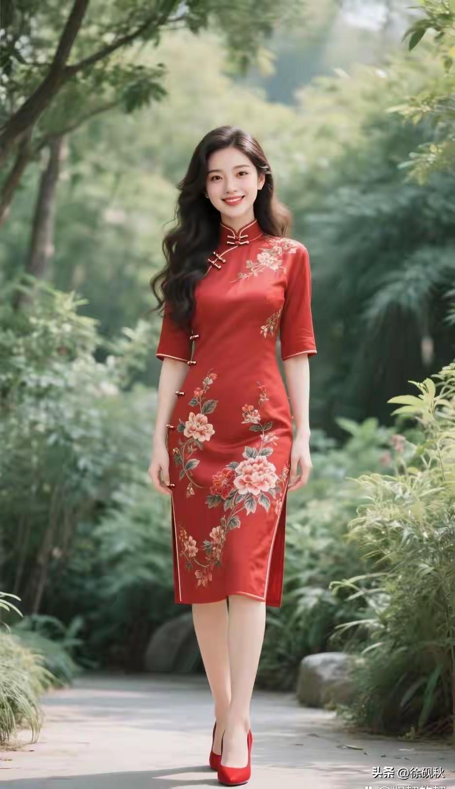 唯有牡丹真国色 花开时节动京城。 旗袍雅致韵味生 红黑牡丹显风情。 中国旗袍,国风古韵。 东方女性,高贵典雅。 领口袖口 ,盘口开叉。 注重细节,精致美观。 举手投足,优雅从容。
