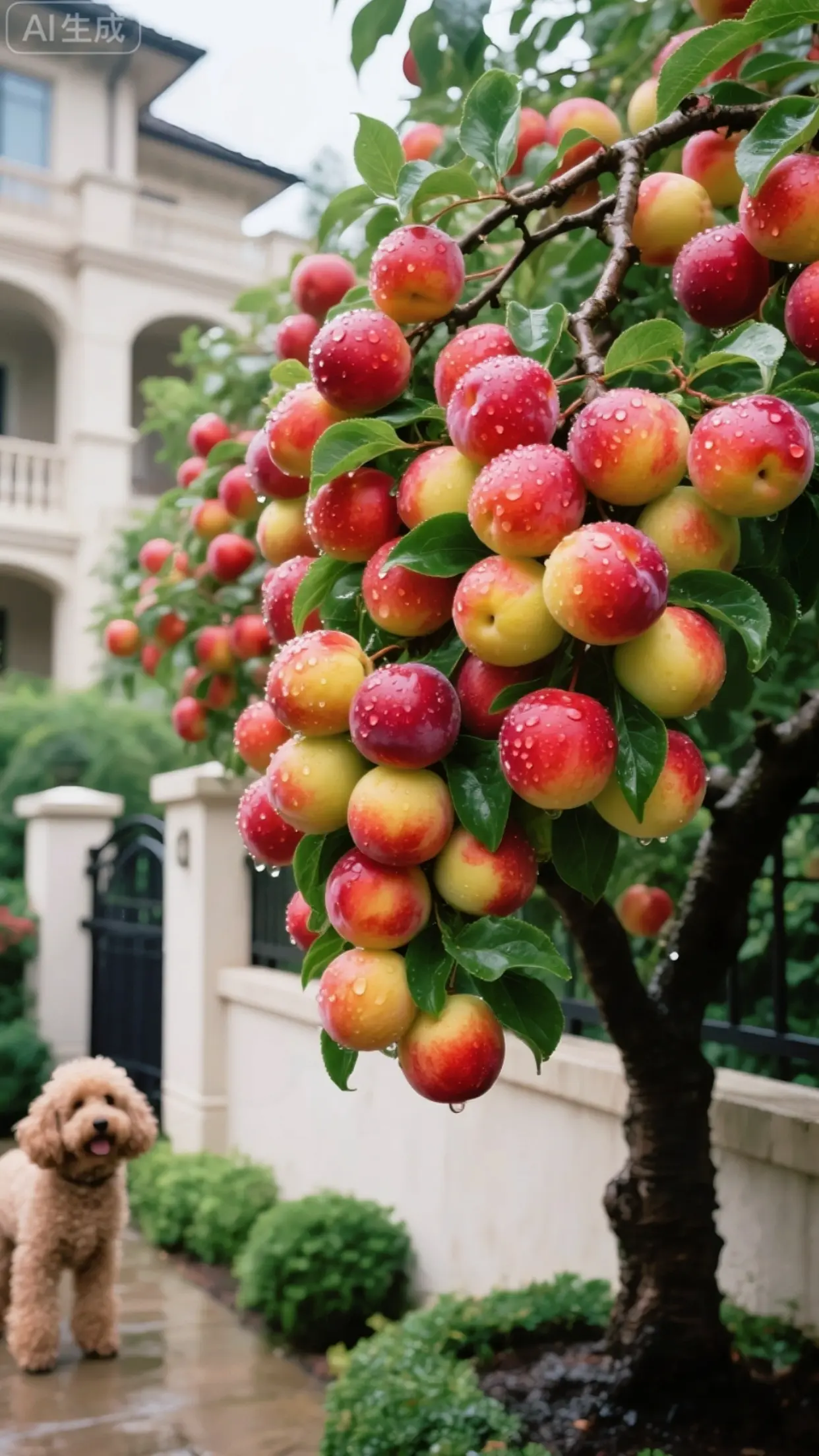 清晨薄雾轻笼,国峰七号李子缀满枝头,颗颗凝着剔透晨露,紫黑油亮,覆着一...