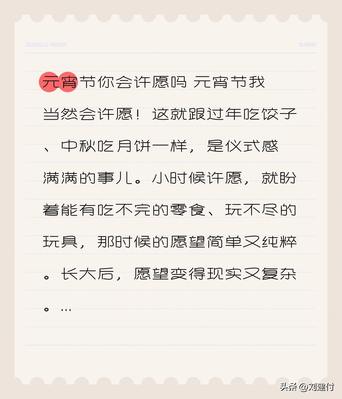 元宵节你会许愿吗 元宵节你会许愿吗?我当然会!这如同过年吃饺子、中秋吃月饼,是极具仪式感的事。 小时候许愿,只盼着有吃不完的零食、玩不尽的玩具,那时的愿望简单而纯粹。 长大后,愿望变得现实又复杂。我会许愿工作顺利、升职加薪,最好少加班;也会许愿家人健康平安,少受病痛折磨。就像去年元宵节,我许愿脱单,结果年底真遇到了那个对的人。所以,元宵节许愿说不定真挺灵!
