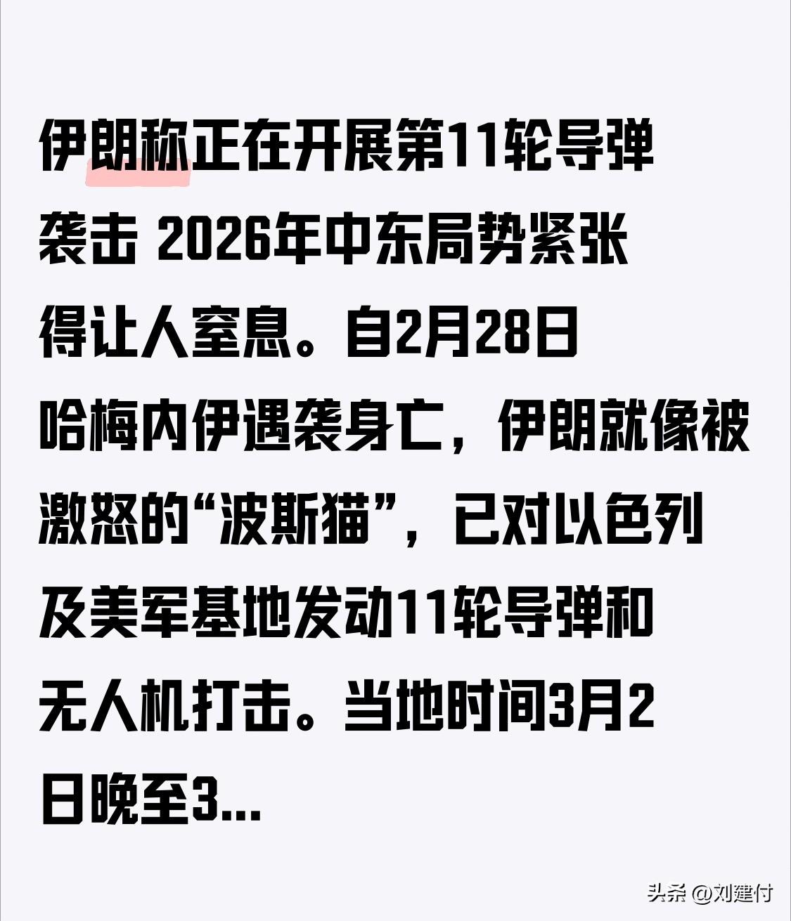伊朗称正在开展第11轮导弹袭击 伊朗称正开展第11轮导弹袭击,2026年中东局势紧张至极。2月28日哈梅内伊遇袭身亡后,伊朗如被激怒的“波斯猫”,已对以色列及美军基地发动11轮导弹与无人机打击。 当地时间3月2日晚至3日凌晨的第11轮攻击堪称“王炸”。法塔赫高超音速导弹撕开防空网,沙赫德 - 136无人机群扰乱局势,中程弹道导弹携集束弹头覆盖目标。以色列中部一片混乱,防空系统难以招架。社交媒体视频中,特拉维夫等地夜空被爆炸火光点亮,集束弹头似“死亡烟花”。以色列12频道报道有老人避难时不幸离世。战争残酷,祈愿和平早日降临。
