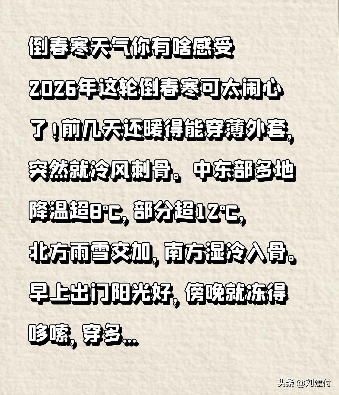 倒春寒天气你有啥感受 倒春寒天气你有啥感受?2026年这轮倒春寒着实闹心!前几天还暖到能穿薄外套,转眼便冷风刺骨。中东部多地降温超8℃,部分地区超12℃,北方雨雪交加,南方湿冷入骨。 早上出门阳光正好,傍晚就冻得人瑟瑟发抖,穿多了热,穿少了冷,真是“穿也不是、脱也不是”。社交平台上大家纷纷吐槽,有网友说羽绒服刚收起来又得翻出来。上班族通勤被冷风吹,学生党因教室宿舍温差大易感冒,中老年人老毛病复发。不过,冷过这一阵,真正的暖春就快来了,再忍忍吧!