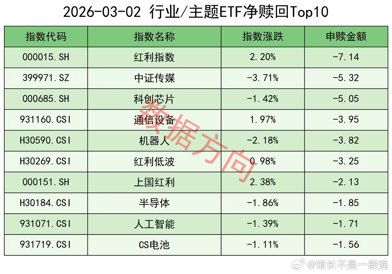 中证传媒指数(-5.32亿)、科创芯片指数(-5.05亿)、通信设备指数(-3.95亿)、机器人指数(-3.82亿)、半导体指数(-1.85亿)、人工智能指数(-1.71亿)、CS电池指数(-1.56亿),泛科技方向集体进入赎回榜。