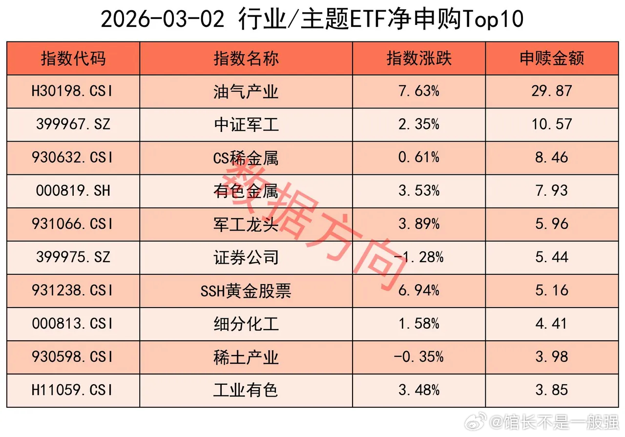 油气产业指数(29.87亿)、中证军工指数(10.57亿)、军工龙头指数(5.96亿)、SSH黄金股票指数(5.16亿)、细分化工指数(4.41亿),受地缘因素影响的指数一起进入申购榜。