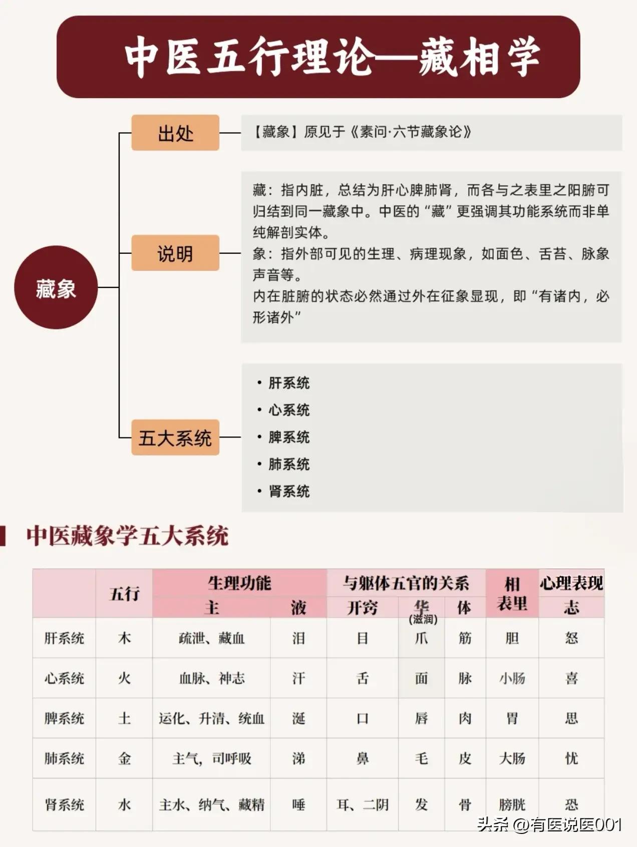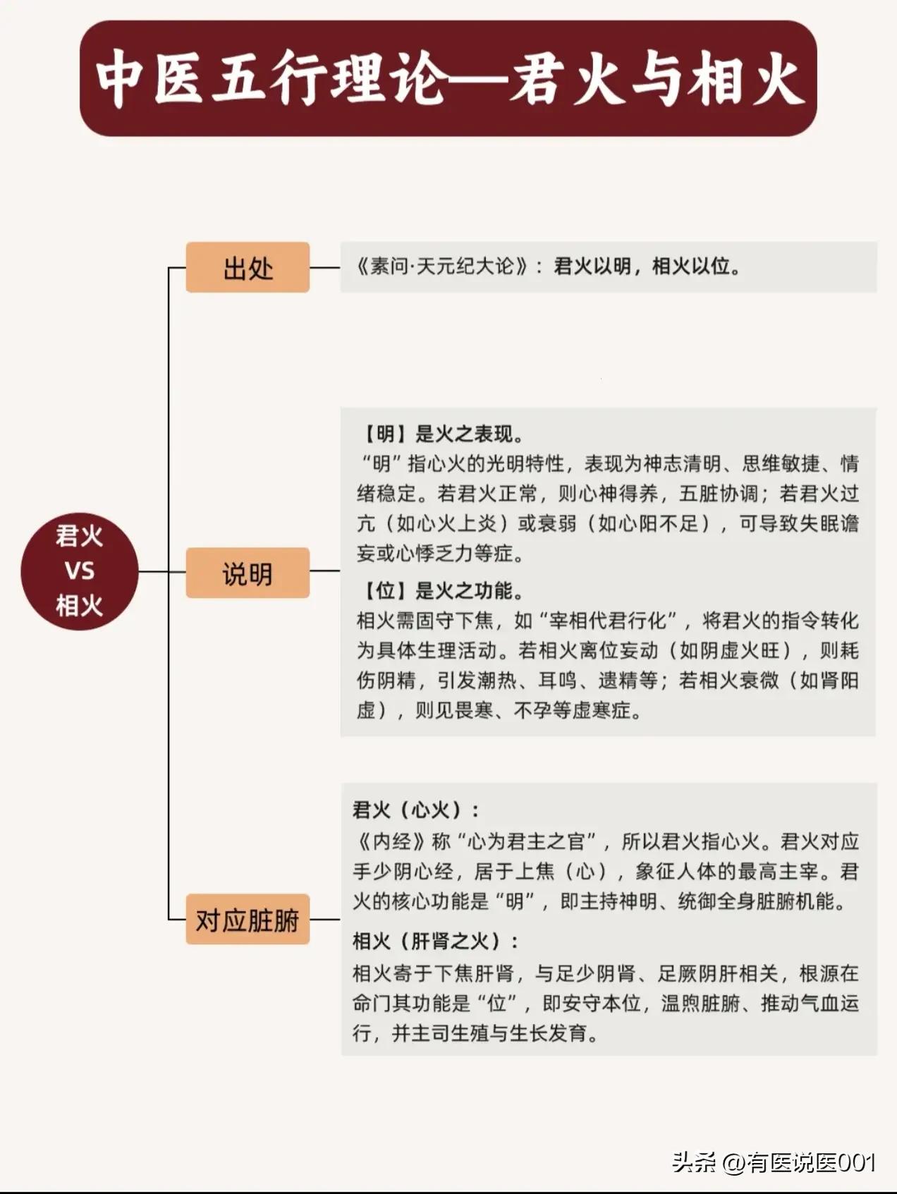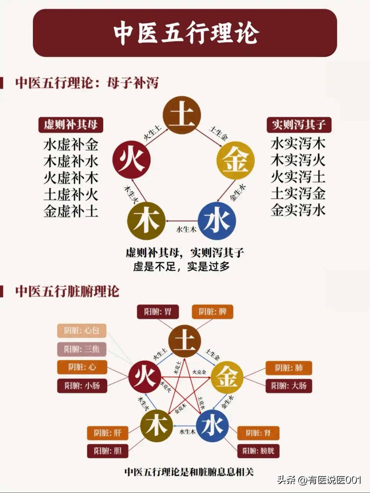 一文读懂中医五行,身体就像个相互照应的小宇宙 很多人觉得“五行”太玄乎,其实它是老祖宗认识身体的一套“系统思维”——把肝、心、脾、肺、肾对应木、火、土、金、水,用相生相克的关系讲清脏腑怎么相互影响,今天用大白话给大家拆解明白。 🌍 五行的核心:相生相克,求的是平衡 五行就像五个互相帮忙又互相约束的朋友: - 相生(相互促进):水生木→木生火→火生土→土生金→金生水,比如肾(水)能滋养肝(木),肝(木)能辅助心(火),一环扣一环给身体“供能”。 - 相克(相互制约):水克火→火克金→金克木→木克土→土克水,比如肾(水)能防止心(火)过旺,心(火)能约束肺(金),避免某一脏腑“太强势”打乱整体节奏。 - 要是平衡破了,就会出问题:比如木太旺“欺负”土(相乘),或者土反过来“压制”木(相侮),对应到身体就是肝旺犯脾、脾虚肝乘这类不适。 🫀 五行对应五脏,身体的“分工表” 五行和五脏一一对应,还各自搭了“表里伙伴”: - 木→肝,配胆:管疏泄情绪、藏血,开窍于眼睛,情绪差、眼睛干常和肝有关; - 火→心,配小肠:管气血运行、神志,开窍于舌头,心慌、失眠多和心相关; - 土→脾,配胃:管消化吸收、生气血,开窍于嘴巴,胃口差、拉肚子常是脾胃弱; - 金→肺,配大肠:管呼吸、体表防御,开窍于鼻子,咳嗽、鼻炎多和肺有关; - 水→肾,配膀胱:管水液代谢、生长发育,开窍于耳朵,腰酸、耳鸣常和肾相关。 🔥 身体里的“两把火”:君火与相火 心叫“君火”,就像身体的“总指挥”,管神志清明,心火旺容易失眠、口舌生疮,心阳不足会心慌、怕冷; 肝肾藏“相火”,像“后勤部长”,安守下焦温煦身体,相火太旺会潮热、耳鸣,相火不足会怕冷、精力差,两者各司其职才是健康状态。 💡 藏象:身体会“说话”,内在问题藏在表象里 中医讲“有诸内,必形诸外”,脏腑的问题会露在外面: - 肝不好,眼睛干涩、指甲脆; - 心不好,面色差、心慌睡不安; - 脾不好,嘴唇干、大便黏; - 肺不好,鼻子堵、毛发干; - 肾不好,耳朵响、头发白。 📌 实用调理思路:母子补泻法 基于相生关系,老祖宗总结了简单思路:“虚则补其母,实则泻其子”—— 比如肺(金)气虚,就补它的“母亲”脾(土),用山药、白术这类健脾的药; 肝(木)气太盛,就泻它的“孩子”心(火),用莲子心、竹叶这类清心的药,比单纯调某一脏腑更温和。 💡 重要提醒:五行是认识身体的模型,不是死板的公式,比如同样是咳嗽,可能是肺本身的问题,也可能是肝(木)犯肺(金)、脾(土)不生肺(金),必须结合体质辨证。想要调理,一定要找专业中医师面诊,别自己对着“五行表”乱用药哦。五行作用关系图