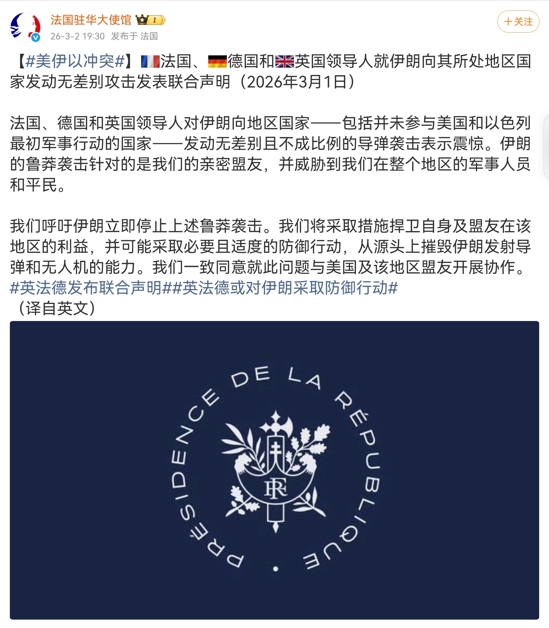 英法德三国联合声明中东这场仗越打越大了