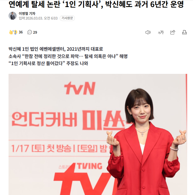 【韩国演艺圈利用一人企划社逃税争议,朴信惠也曾运营一人企划社长达6年】海外新鲜事热点现场