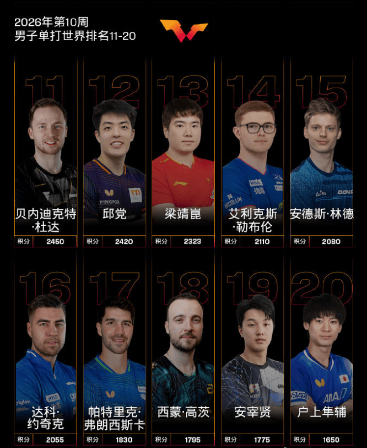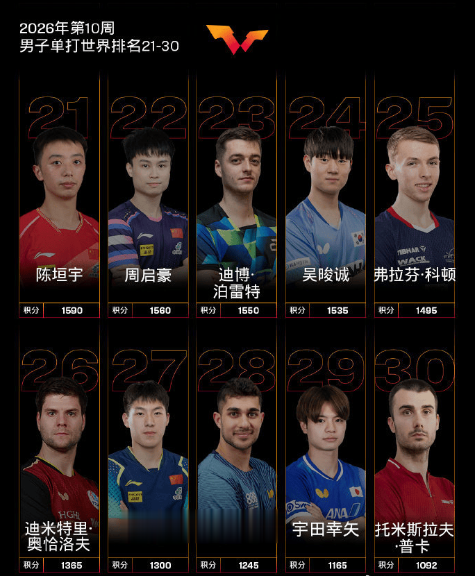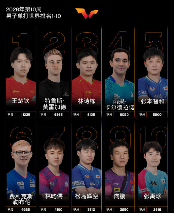 男子单打方面,王楚钦、莫雷高德和林诗栋位列前三位,雨果第4,张本智和第5。其他中国球员方面,向鹏第9,梁靖崑第13,陈垣宇第21,周启豪第22,温瑞博第27。