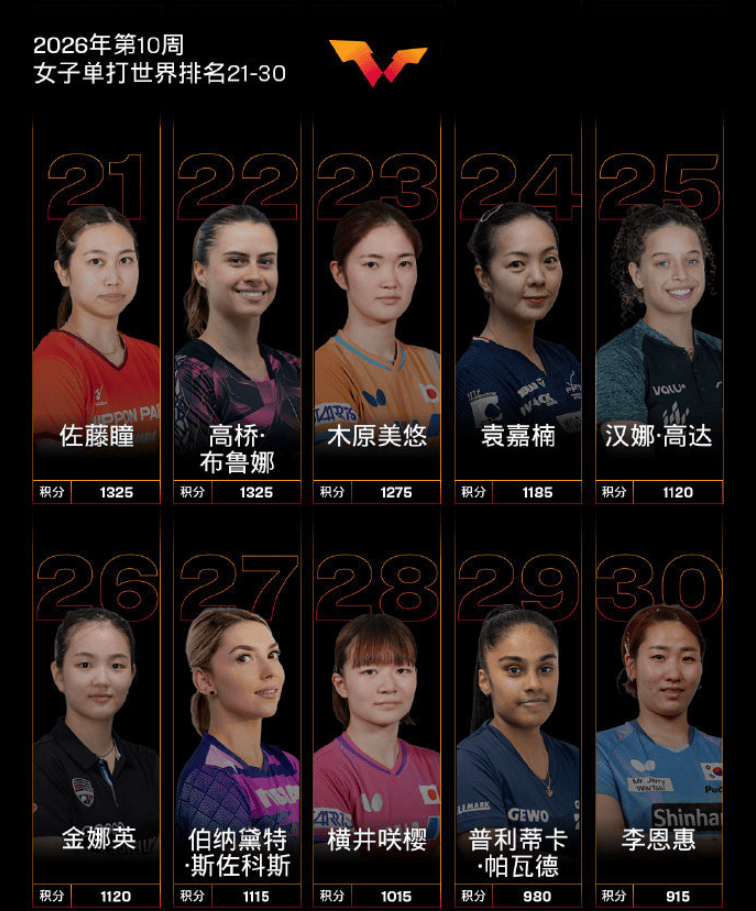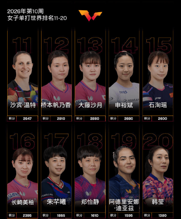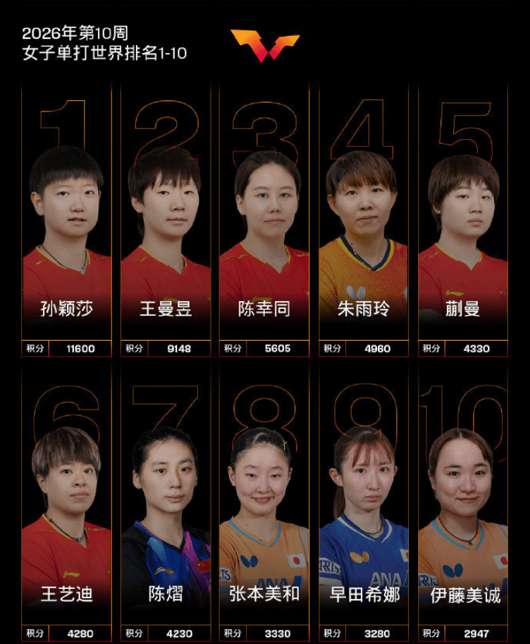 女子单打方面,孙颖莎、王曼昱和陈幸同继续位列前三位,朱雨玲、蒯曼、王艺迪和陈熠分列第4-7位,石洵瑶第15位。