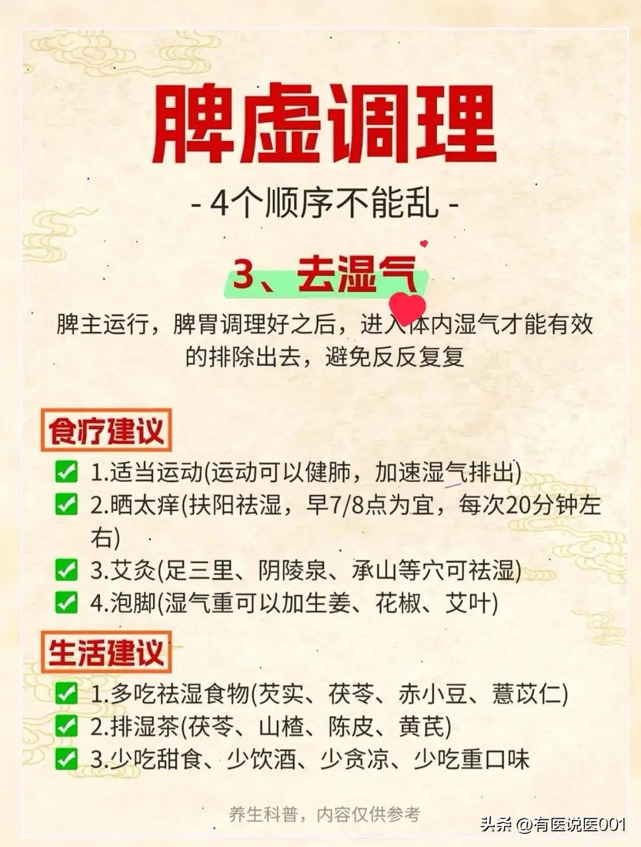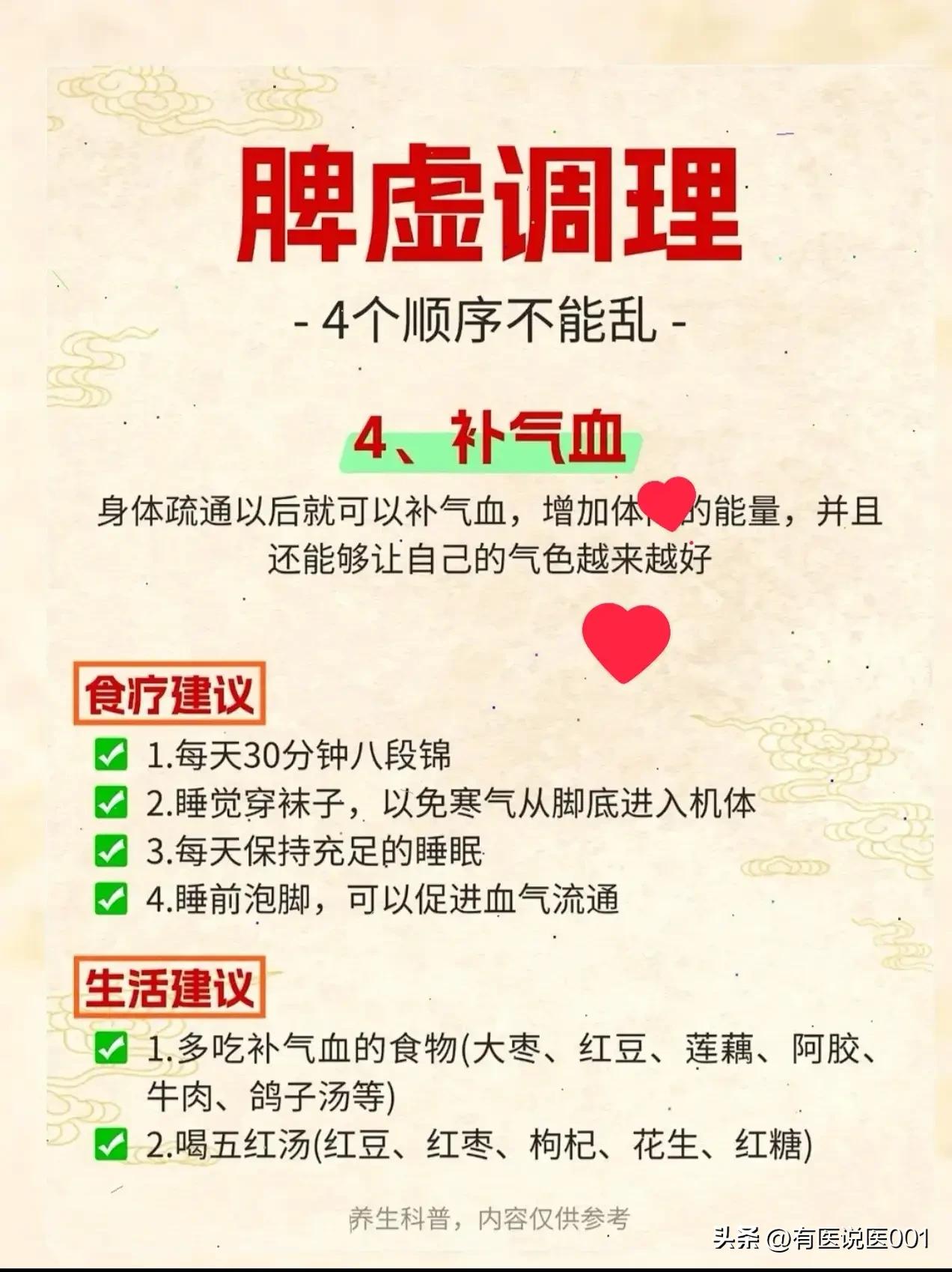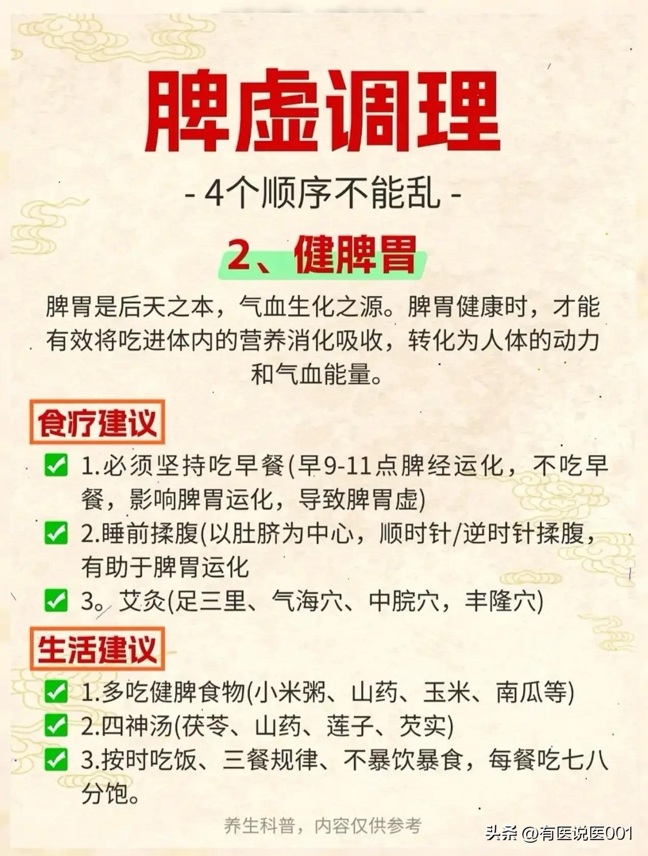 脾虚调理别瞎补,4步顺序走对了,脾胃才能慢慢养回来 不少人脾虚就猛吃红枣、阿胶补气血,结果越补越胀、湿气更重,其实脾虚调理得讲顺序,这4步走对了,脾胃才能一步步回春,今天用大白话给大家讲明白。 🌿 第一步:先疏肝,给脾胃“松绑” 中医讲“肝木克脾土”,肝就像管着脾胃的“邻居”,要是经常生气、熬夜,肝气堵得慌,就会欺负脾胃,让它没法好好运化食物。所以调理脾虚,得先给肝“顺顺气”。 日常可以喝陈皮茯苓茶(陈皮、茯苓、山楂、黄芪)或者玫瑰菊花茶,帮身体疏解郁气;生活上尽量11点前睡,没事敲敲胆经、刮刮肝经,睡前泡个脚,再抽30分钟做做有氧运动,肝气顺了,脾胃才有劲儿干活。 🌾 第二步:健脾胃,筑牢“后天之本” 脾胃是气血生化的“源头”,只有脾胃健起来了,吃进去的东西才能变成身体的能量。这一步得把脾胃的“消化力”找回来: 一定要吃早餐,早上9-11点是脾经运化的时间,不吃早餐最伤脾胃;睡前以肚脐为中心揉腹,帮脾胃推推“消化进度”;也可以艾灸足三里、气海、中脘这些健脾穴位。 日常多吃小米粥、山药、玉米、南瓜这类温和的健脾食物,也可以煮四神汤(茯苓、山药、莲子、芡实)喝,三餐规律别暴饮暴食,每顿吃七八分饱就好。 💧 第三步:去湿气,避免“反复拖后腿” 脾主运化水湿,脾胃调理好了,体内的湿气才能顺利排出去,不然湿气堵着,调理效果总会打折扣。 可以通过运动健肺,加速湿气排出,早上7、8点晒20分钟太阳也能扶阳祛湿;艾灸足三里、阴陵泉、承山,或者泡脚时加生姜、花椒、艾叶,都是祛湿的好办法。 饮食上多吃芡实、茯苓、赤小豆、薏苡仁这类祛湿食材,少碰甜食、冷饮和重口味食物,减少湿气生成。 🩸 第四步:补气血,给身体“充能量” 等肝气顺了、脾胃健了、湿气排了,身体通道都通了,再补气血才不会“补不进去”。 每天练30分钟八段锦,睡觉穿袜子避免寒气从脚底钻进来,睡前泡脚促进气血流通;饮食上多吃大枣、红豆、莲藕、牛肉这类补气血的食物,也可以煮五红汤(红豆、红枣、枸杞、花生、红糖)喝,慢慢把气血养足,气色也会越来越好。 ⚠️ 温馨提示:这些都是日常调理的参考方法,不能替代药物治疗!如果脾虚症状严重(比如长期腹泻、剧烈腹痛、严重乏力),一定要及时找专业中医师辨证调理,别自己盲目食补哦