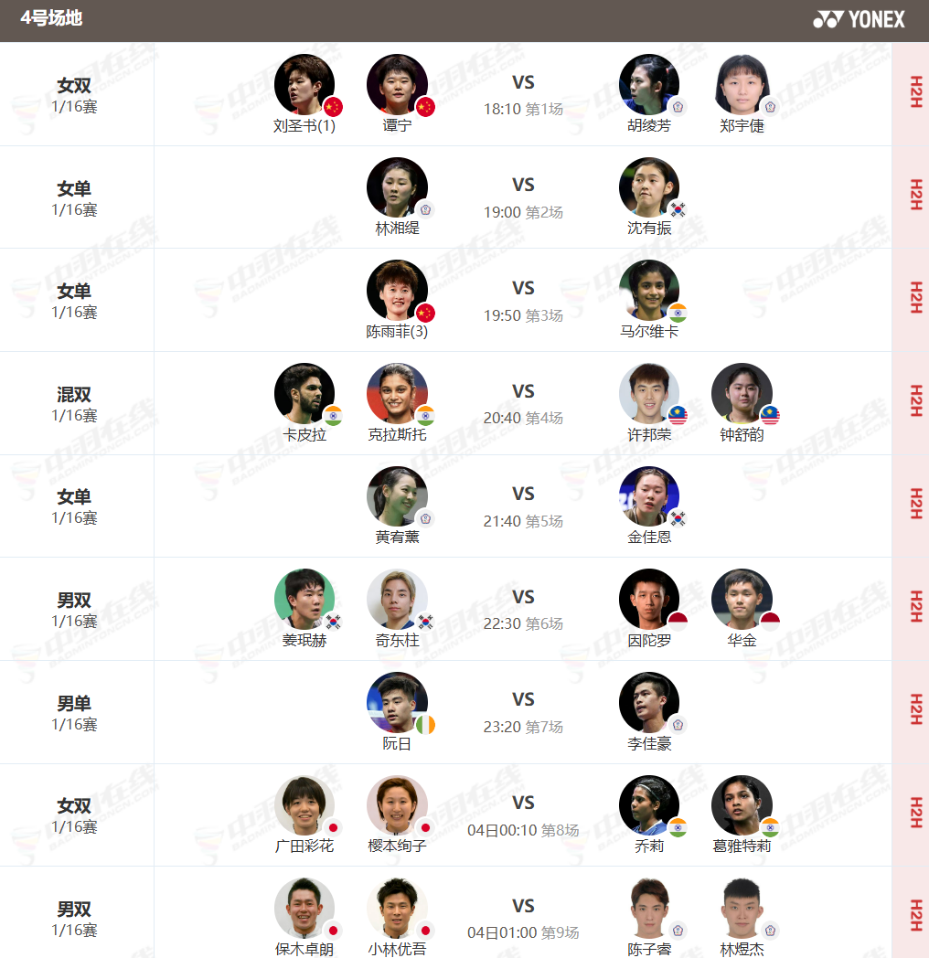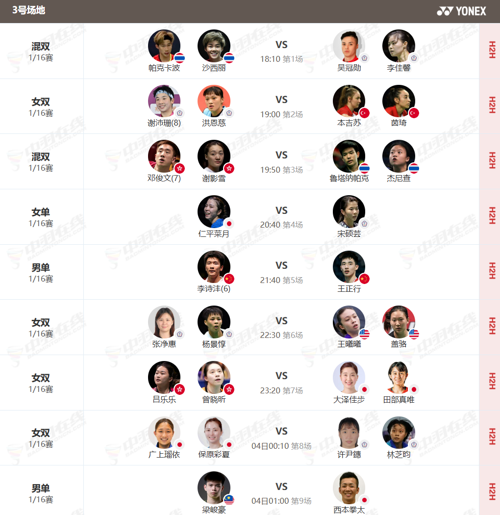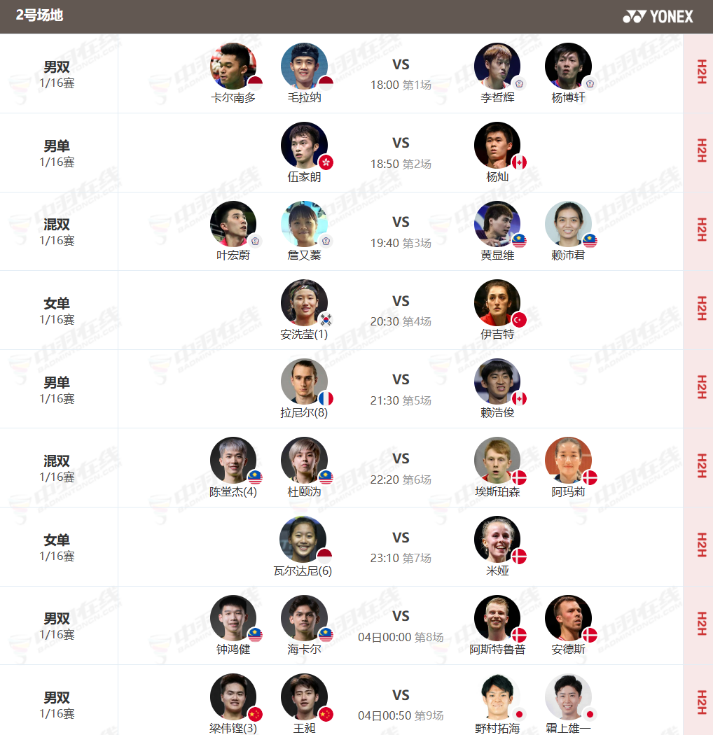 虎扑03月03日讯2026年超级1000全英羽毛球公开赛首日赛程已经公布,男单世界第一、中国名将石宇奇继25年世锦赛后,将再次在首轮迎战印度名将拉克什亚;李诗沣和王正行则会在另一场男单首轮的比赛中上演一场国羽内战。