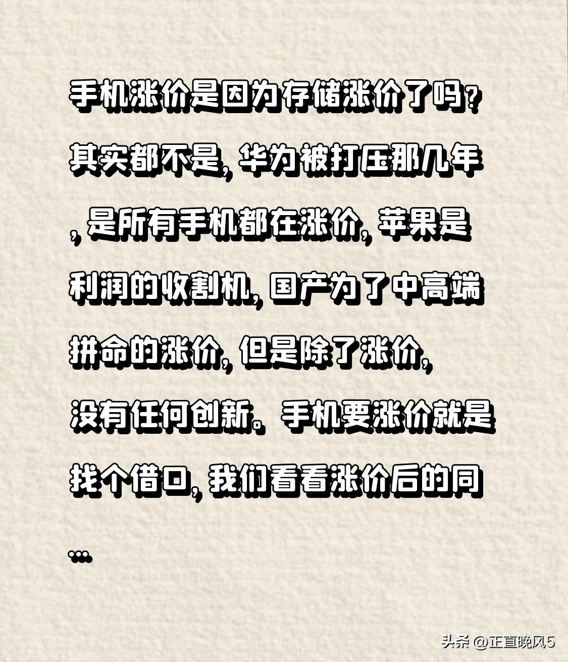 手机涨价是因为存储涨价了吗?其实都不是,华为被打压那几年,是所有手机都在涨价,苹果是利润的收割机,国产为了中高端拼命的涨价,但是除了涨价,没有任何创新。 手机要涨价就是找个借口,我们看看涨价后的同款手机,后面还降不降价就知道了,如果发布手机是6999,上市后销量不好降价,难道是亏本卖吗?都亏本卖了,那怎么还是亿万富翁。
