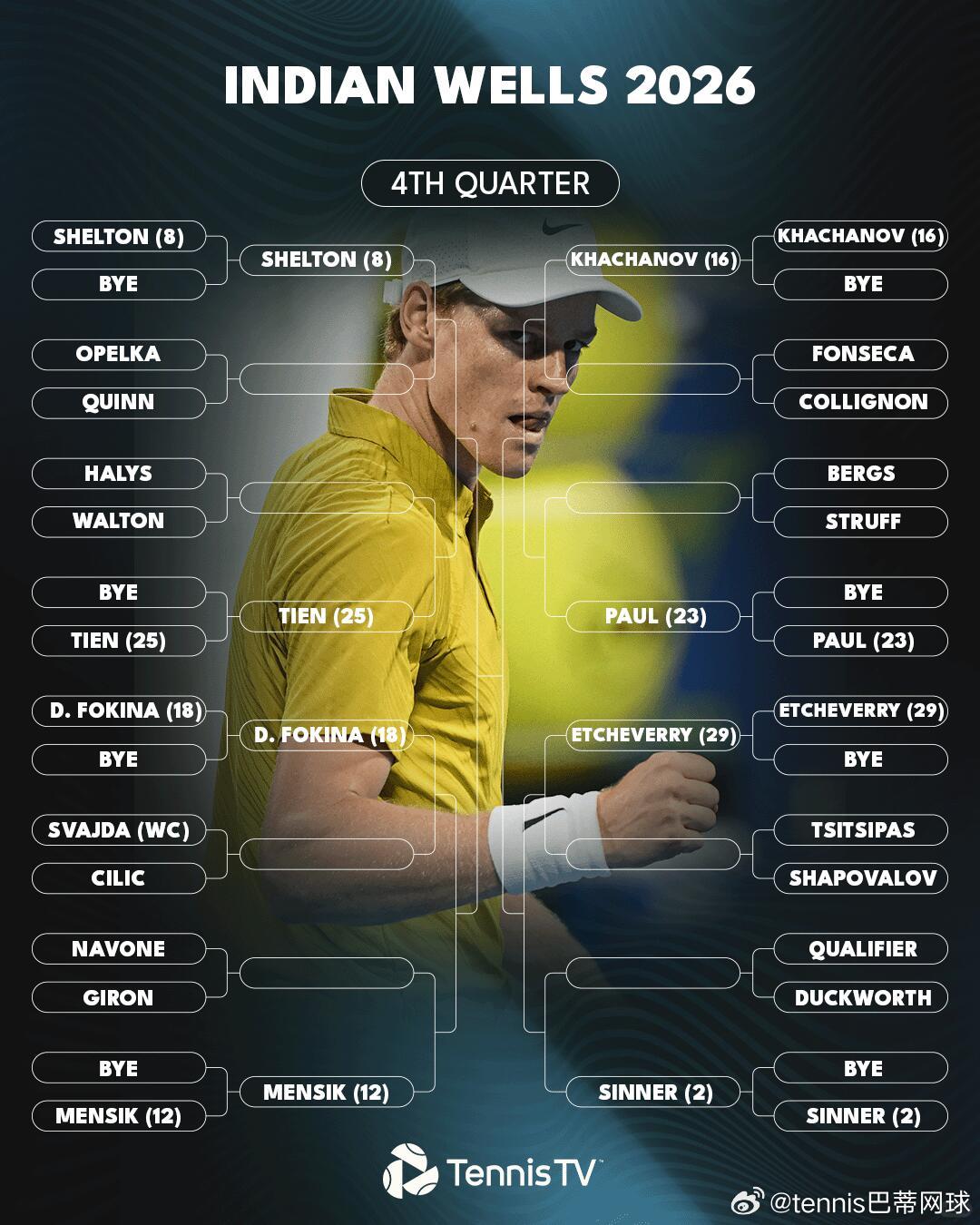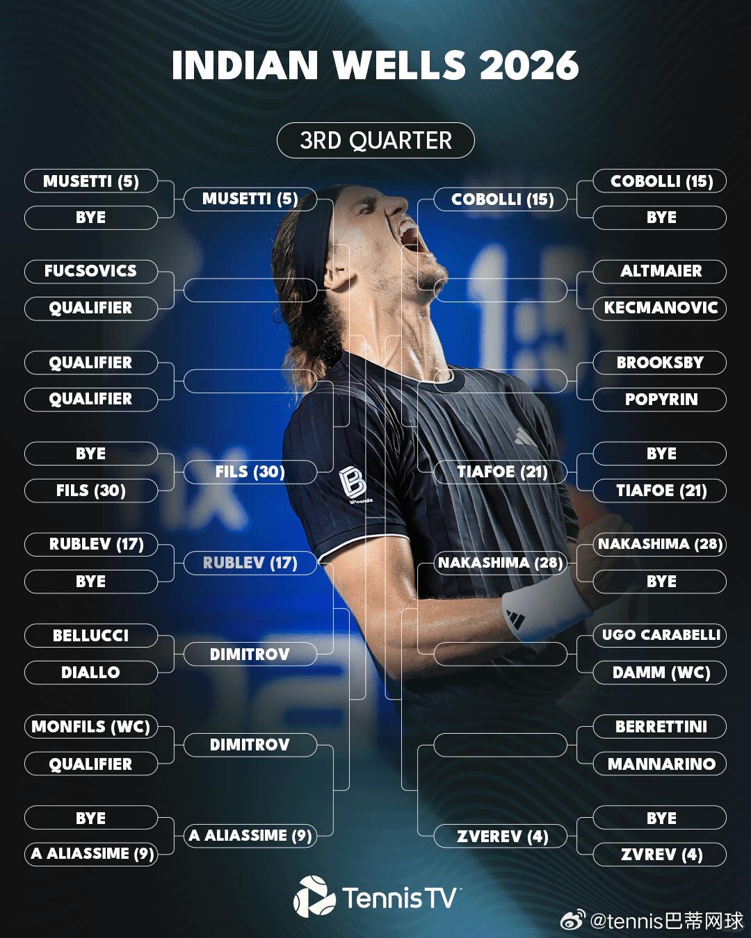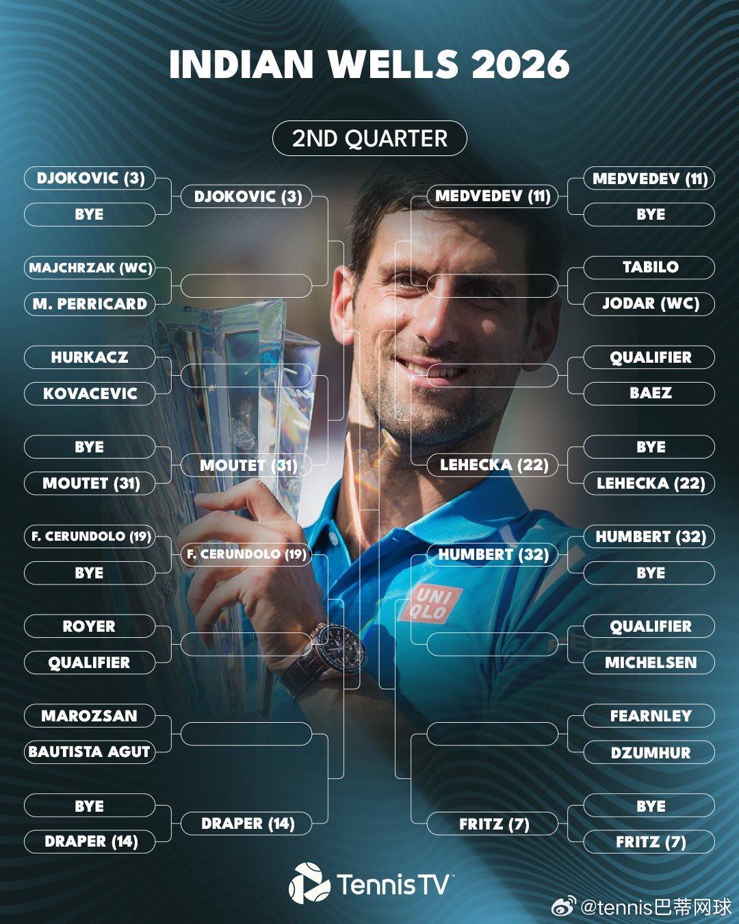 印第安维尔斯男单签表前8种子对位1阿尔卡拉斯-6德米纳尔3德约科维奇-7弗里茨5