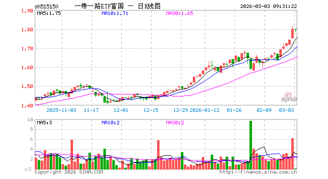 3月3日,一带一路ETF富国(515150)开盘跌0.06%,报1.800元。一带一路ETF富国(515150)重仓股方面,小商品城开盘跌0.14%,金风科技涨0.04%,中国铝业涨0.14%,烽火通信涨3.00%,东阿阿胶跌0.07%,南网能源跌0.48%,广东宏大跌0.58%,云铝股份涨0.85%,建设银行跌0.11%,中国联通跌0.20%。