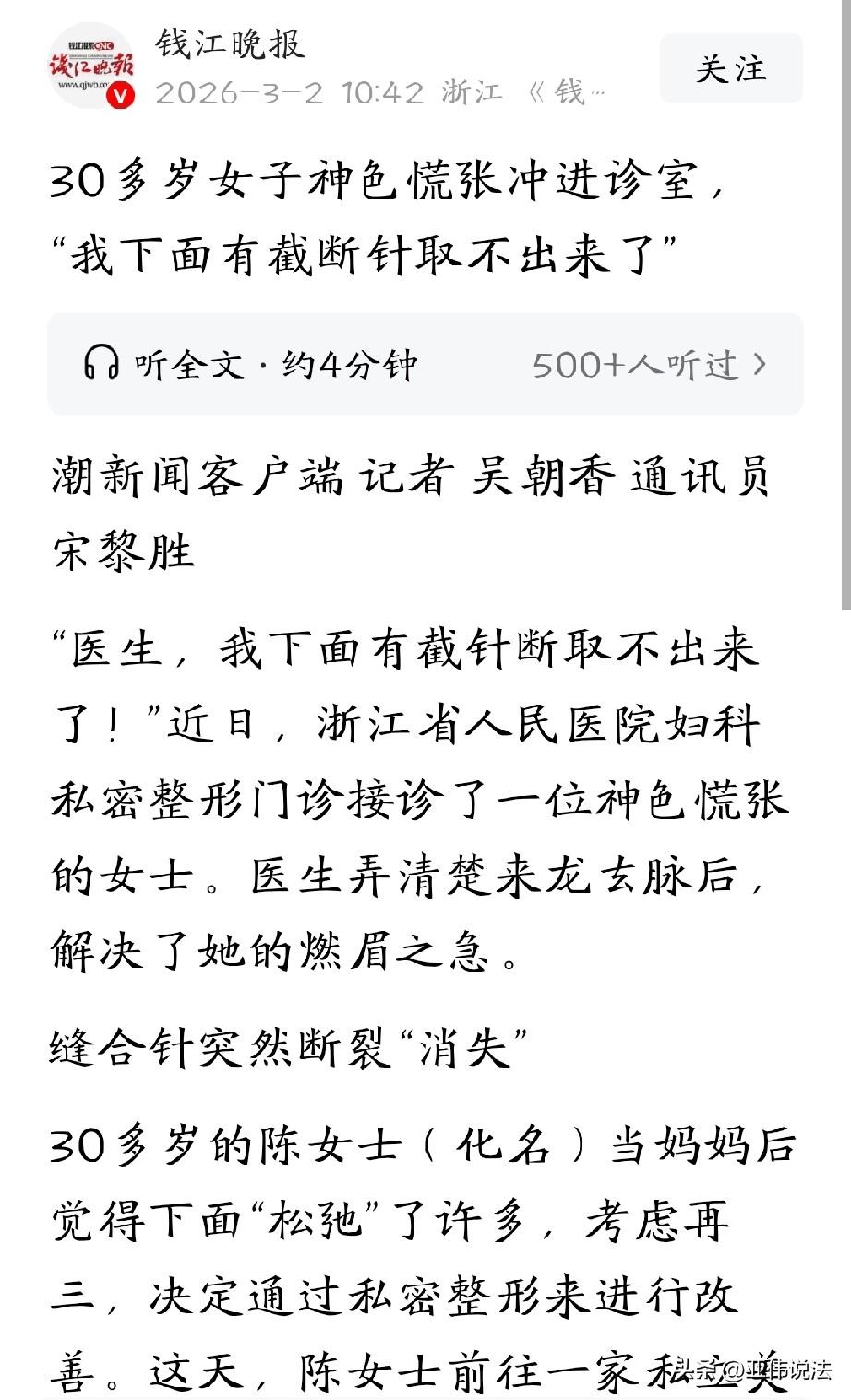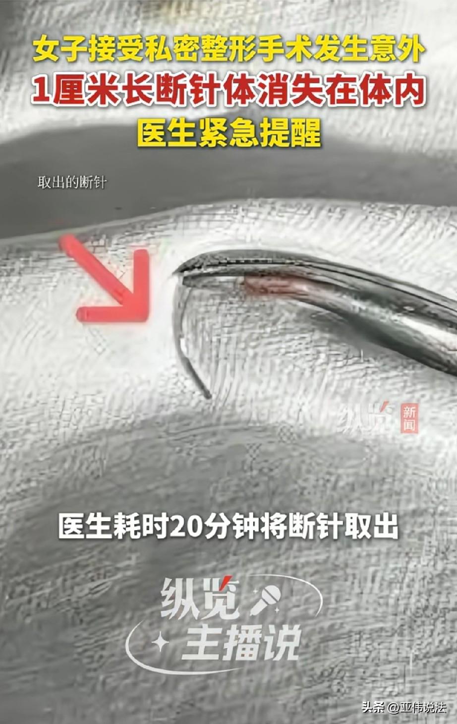 太惊险了!浙江,女子生完孩子后,觉得下面不如以前紧致,为了重拾自信,她选了一家私立的美容机构,去做阴道紧缩手术。谁知,手术过程中,缝合针突然断掉,一厘米长的断针进入她的身体,怎么都找不到。女子吓得半死,就在这惊魂一刻,她赶紧来到正规医院,仅用20分钟,医生便将断针取了出来。 半个多月前,浙江省人民医院妇科私密整形门诊的走廊里,突然冲进来一个30多岁的女人。 她脸色煞白,额头上全是汗,抓着导医台的手都在抖:医生呢?快帮我看看,我下面有截断针,取不出来了! 这个女人就是陈女士。原来,陈女士生完孩子后,一直觉得下面不如以前紧致,这件事在她心里压了很久,跟几个姐妹私下聊过之后,她动了做私密整形的念头。 一番考察后,她选了一家私立美容机构。 那天下午,她躺在手术台上,等着做阴道紧缩手术。 谁知,手术刚开始没多久,意外就发生了,缝合针突然断了。 陈女士还没反应过来,就感觉操作的人动作顿了一下,紧接着,对方在下面翻找起来,器械进进出出,但什么也没找到。 针呢?陈女士吓得声音都变了。对方没吭声,又找了一会儿,最后直起身,脸色也很难看:断了,有一截大概一厘米的,找不到了。 陈女士脑子嗡的一下。她躺在那里,能清楚感觉到身体里有东西,说不上多疼,就是时不时刺一下,像有什么尖的东西在里头。 她越想越害怕,这针会不会在身体里游走?会不会扎破哪儿?要是跑到别的地方去怎么办? 操作的人又试了几次,但常规的窥器根本看不到断针的影子。两人都意识到,再这么折腾下去,风险只会越来越大。 就在这惊险时刻,经人引荐,陈女士联系上了浙江省人民医院。医生一边安抚她,一边紧急安排了CT检查。 CT结果出来了:断针就在阴道中段的某个位置。 可奇怪的是,就算知道了大概位置,常规检查还是看不到那根针。 原来,阴道壁有很多皱襞,弹性也大,针很可能已经刺进组织深处,被皱襞盖住了。就像在迷宫里找一根针,光靠眼睛看根本没用。 医生只能靠影像定位,加上手一点点去摸。找了半天,终于在深部组织里摸到了一个细微的硬物,就是那根“失踪”的断针。 经过一番细致操作,二十多分钟后,那截一厘米长的断针终于取出来了。陈女士躺在床上,长长地出了一口气。 陈女士的遭遇,真是太吓人了! 女人生完孩子后,想变紧致、想改善自己,这一点一点错都没有,爱美、追求舒服都是人之常情,但千万不能拿自己的身体去冒险! 私密部位跟别的地方不一样,血管多得数不清,旁边就是尿道、直肠,手术要求高很高,一旦操作不当,轻则局部损伤,重则可能休克甚至死亡。 那些私立美容机构,看着包装得高大上,很多根本没有做这种手术的资质,操作人员也不是专业的妇科医生,一出事就慌神,最后受罪的还是我们自己。 正规医院就完全不一样,有设备、有技术、有应急方案,CT定位、医生精细操作。 真的劝大家一句,私密整形不是普通美容,这是实打实的医疗手术!别听人家忽悠几句、价格便宜点就动心,拿身体赌便宜、赌运气。 出了事,后悔都来不及,要做就一定要去正规大医院,找专业医生,这才是对自己最负责的做法。 《民法典》第1222条规定,医疗机构违反法律、行政法规、规章以及其他有关诊疗规范的规定,推定其有过错。 本案中,私立美容机构无医疗资质、不具备手术条件,擅自开展阴道紧缩手术,属于严重违反诊疗规范,直接推定该机构存在过错,需对陈女士的人身损害与精神损害承担全部赔偿责任。 从医疗合规与监管层面看,阴道紧缩术属于创伤性医疗美容项目。 非正规机构无证行医、操作失当引发断针滞留,既触犯医疗行业监管规定,还可能构成非法行医,面临行政处罚乃至刑事追责。 这也提醒所有求美者,私密整形必须选择有资质的正规医院与执业医师,才能规避风险,保护自己。