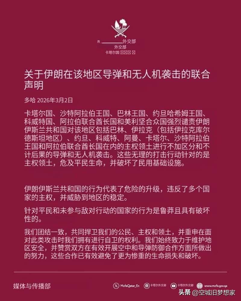 被夹在中间的海湾国家:一边谴责,一边默许? 看完卡塔尔牵头的这份多国联合声明,再对照伊朗导弹的实际射程和蔡正元博士的分析,就能读懂海湾国家的复杂心态了。 表面上,卡塔尔、沙特、阿联酋等国强烈谴责伊朗的导弹和无人机袭击,强调自己的主权和领土完整不容侵犯。但从地缘政治的现实来看,这些国家内心深处,恐怕都盼着美以能彻底解决伊朗这个“家门口的劲敌”,好让自己能睡个安稳觉。 可现实是,伊朗的导弹射程有限,目前能打击的,也只有周边国家境内的美军基地。这就形成了一个极具讽刺意味的局面: - 伊朗的导弹,打的是美军基地,却落在了邻国的土地上。 - 邻国一边谴责伊朗袭击了自己,一边又同意美军使用自己的基地去打击伊朗。 这种“又怕又盼”的矛盾,正是当前中东乱局的真实写照。当你允许别人在你家里磨刀,就别怪刀光剑影先溅到自己身上。伊朗怒批美国 沙特伊朗矛盾 卡塔尔袭击事件 海湾国家危机 沙特科威特 卡塔尔怒了