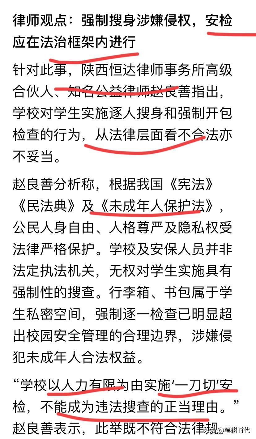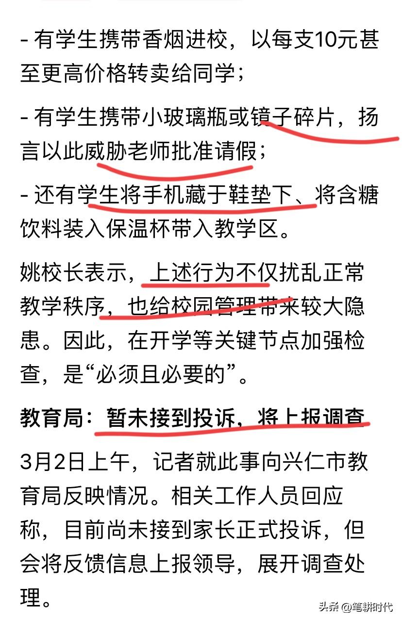 返校被搜查疑侵犯隐私,有学生带烟进来一支卖10元或许还不止,只有脑子有问题的家长才会攻击学校搜查违禁品! 有些人质疑学校,但凡孩子们带打火机,管制刀具到学校,一旦出事,你的口水怕是能把整个学校淹了! 有律师认为,学校对学生实施逐人搜身和强制开包检查的行为,不能成为违法搜查的正当理由。这不符合法律规定,也不利于保护学生身心健康。 这事本来就是家长的问题,如果家长能管住自己的孩子,不带不该带的东西,学校又何必多此一举?出了问题又埋怨,甚至去讹诈学校,学校能怎么办? 每一个离谱的规定,后面必须有一个奇葩的惨痛的教训。 现在有些家长不干正事动不动就上纲上线,等小树苗长歪了那天后悔就晚了! 我绝对支持学校安检,作为孩子家长我觉得可以理解,毕竟打火机,管制刀具之类的太危险了。严格检查携带物品进校是维护学生的安全必要手段。 把不该进校园的东西带进去造成事故,那又是学校天大的责任!把公民隐私权扩大化给社会带来了多大的灾难? 学校就该有学校的规矩!隐私从来都在公共安全上让步! 只有现在老师的角度去看待学生才会理解学校的做法!