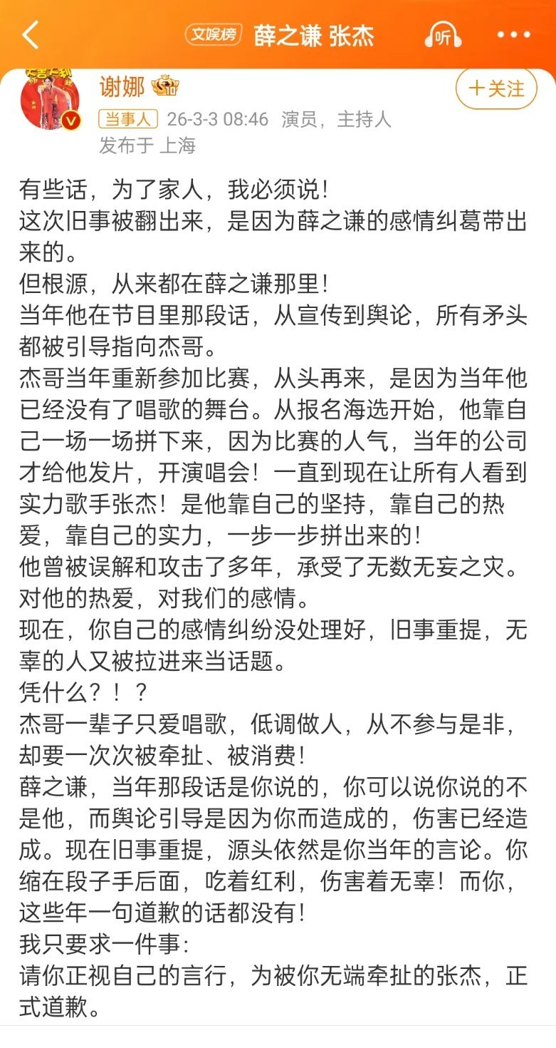 谢娜喊话薛之谦挺神的哈,看人家快翻车了才出来喊话,以前咋不喊呢?让薛之谦给张杰道歉呢