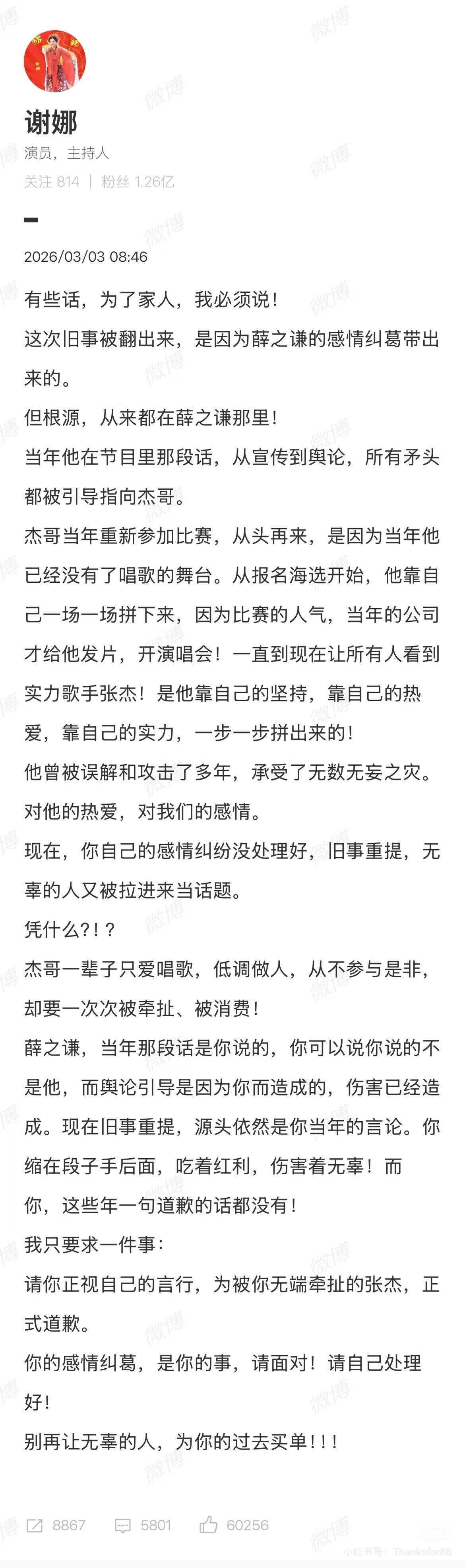 谢娜喊话薛之谦正月十五早上谢娜发长文表示要求薛之谦向无端被牵扯的张杰正式道歉!并