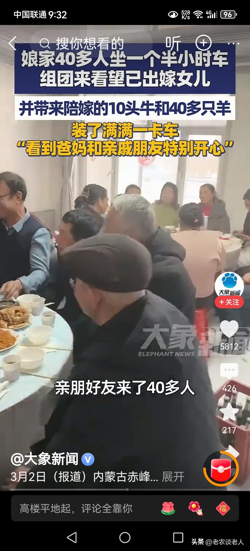 娘家40多人组团去看望已出嫁女儿! 在我们的现实生活中,每一个家庭的亲人,去看望已经出嫁姑娘的时候,一般情况下,都是出嫁姑娘的父母和兄弟姐妹几个人,就足够了。 但是,从未见过,更未听说过,娘家组团四五十人,浩浩荡荡的亲人团去看望已经出嫁的姑娘,是十分罕见的,是从未见过的。 据媒体3月3日报道,内蒙古赤峰市一户牧民家庭,组了一个40多人的亲人团,乘坐一个半小时的车,才能到达已经出嫁女儿家里,带着10头牛和几十只羊,来看望闺女。 通过这则新闻故事,回到我们的现实生活中来,本人认为,父母痛爱出嫁的女儿,是人之常情。一般情况下,父母、儿女们、儿媳妇、女婿,以及孙辈,一个家庭全家出动最多也不超过10来个人。 这一个牧民家庭能出动40多人,说明是一个大家庭,不是一个普通小家庭,已嫁姑娘的兄弟姐妹非常之多,包括兄弟姐妹的配偶以及侄儿侄女等等。 另外,他们都是少数民族家庭,有出嫁姑娘父母的兄弟不分家的习惯,兄弟姐妹多,婶婶嫂嫂多,姨爷姨娘多,弟妹弟媳多,侄儿侄女,全部出动才能够有这么大的团队。 总而言之,出嫁女儿,永远是父母的牵挂,是父母的心肝,是父母最痛爱的人,是父母最亲近的人。娘家人在春节前后去看望已经出嫁的姑娘,也是一种感情的流露和连接。
