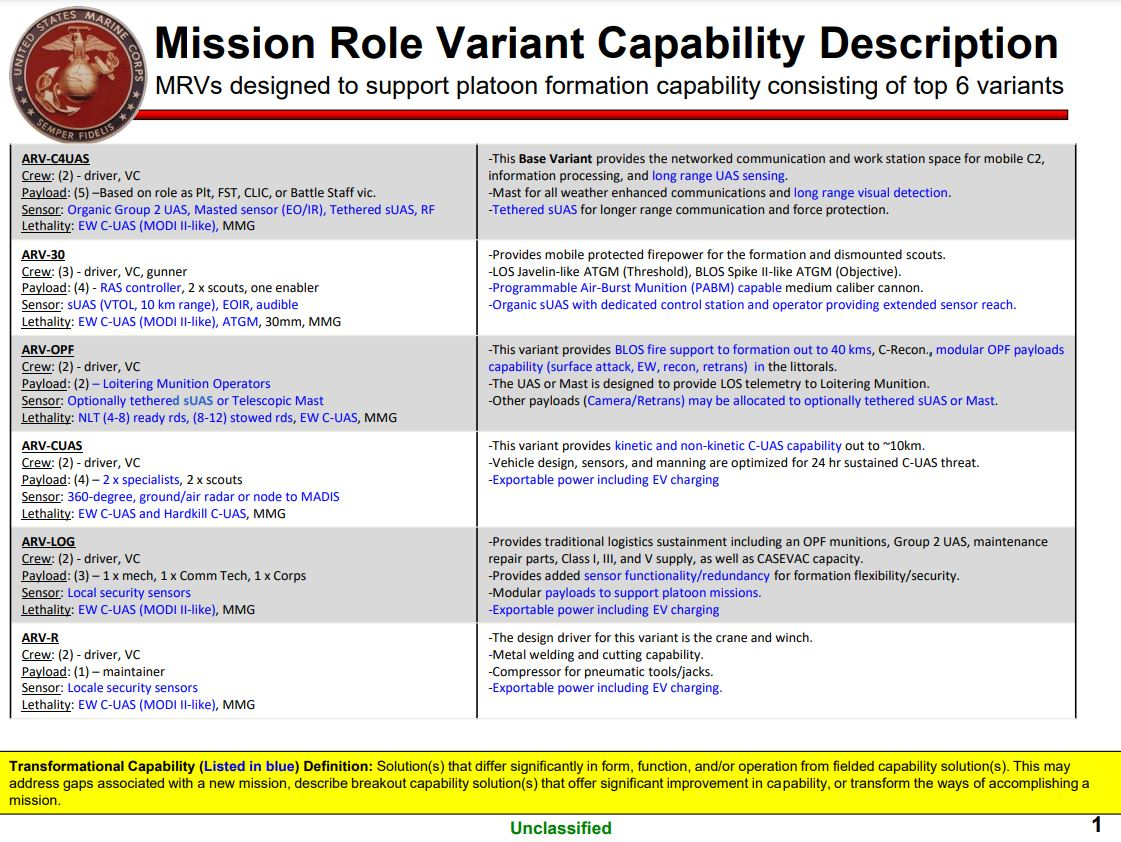 :根据美国海军陆战队的要求,新的先进侦察车辆(ARV)必须具备几点特征,包括足够的陆上机动性;一定的两栖能力以在水上航行;与LAV-25相近的尺寸,可由LCAC气垫登陆艇运输4辆;具备一定的动能与非动能打击能力,满足杀伤能力需求(需装备30毫米XM813或Mk44S);具有战术战斗管理系统的现代化C4I通信套件;可操作无人载具以加强陆战队轻装甲侦察部队(LAR)的作战能力;具有增强和更大侦察距离的先进传感器,提供全天候多波段的持续侦察与监视能力。