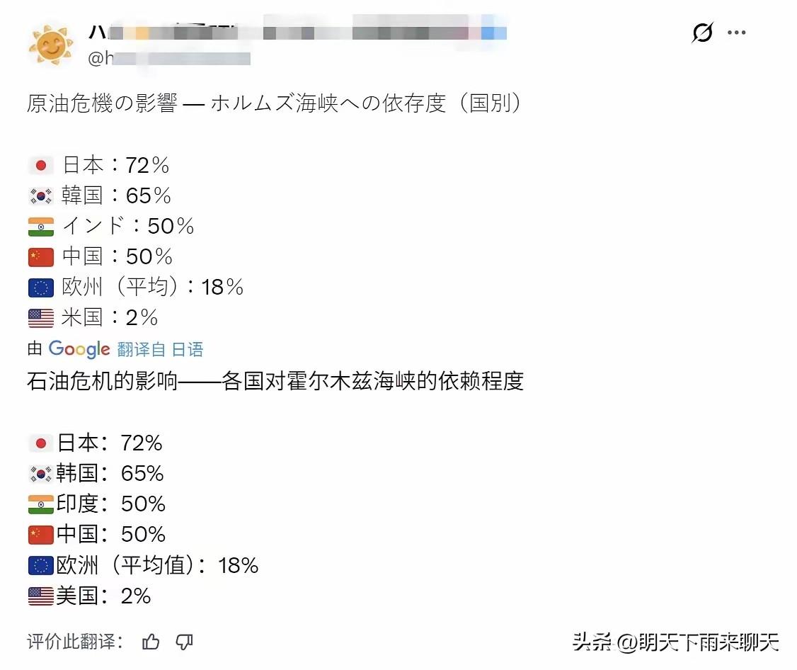 霍尔木兹这一封,日本可真慌了? 日本99.7%的原油需要进口,其中95%来自中东,而超过70%的油轮必须走霍尔木兹海峡,如今这海峡不通畅了,高市早苗率先心堵了。 石油储备还能撑250多天,但天然气储备仅够3周,一旦封锁时间拉长,能源链直接断裂。有预测显示,如封锁半年,油价飙升推高通胀,重创各支柱产业,日本GDP将下滑3%,再叠加日元贬值,这巨大冲击将难以承受。 如油轮绕行好望角,航程增加40%,成本暴涨30%以上,也同样难以承受,只不过换了个死法而已。 高市早苗现在真的遇上事了,而且是真正的生存危机,屋漏偏逢连夜雨,如何化解?