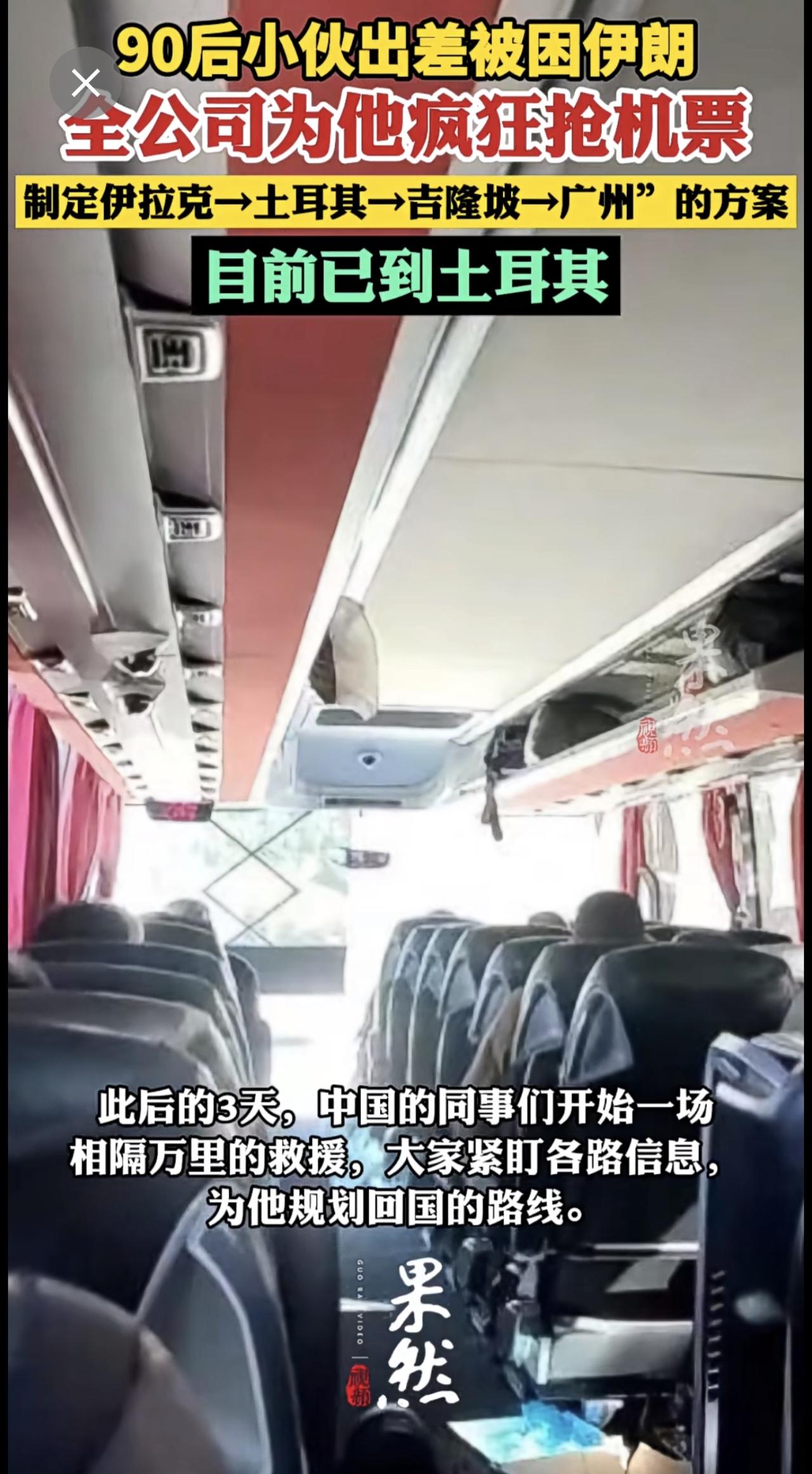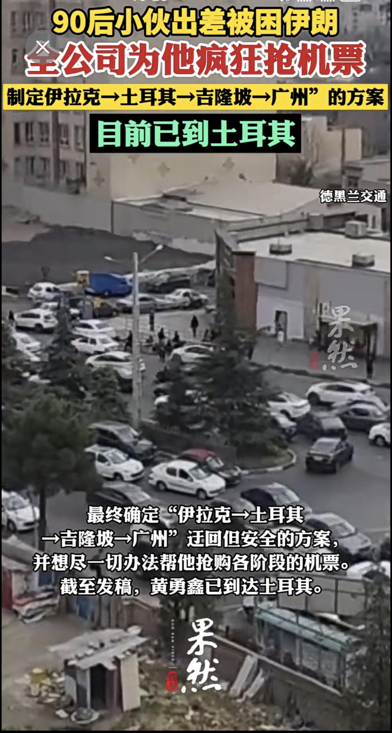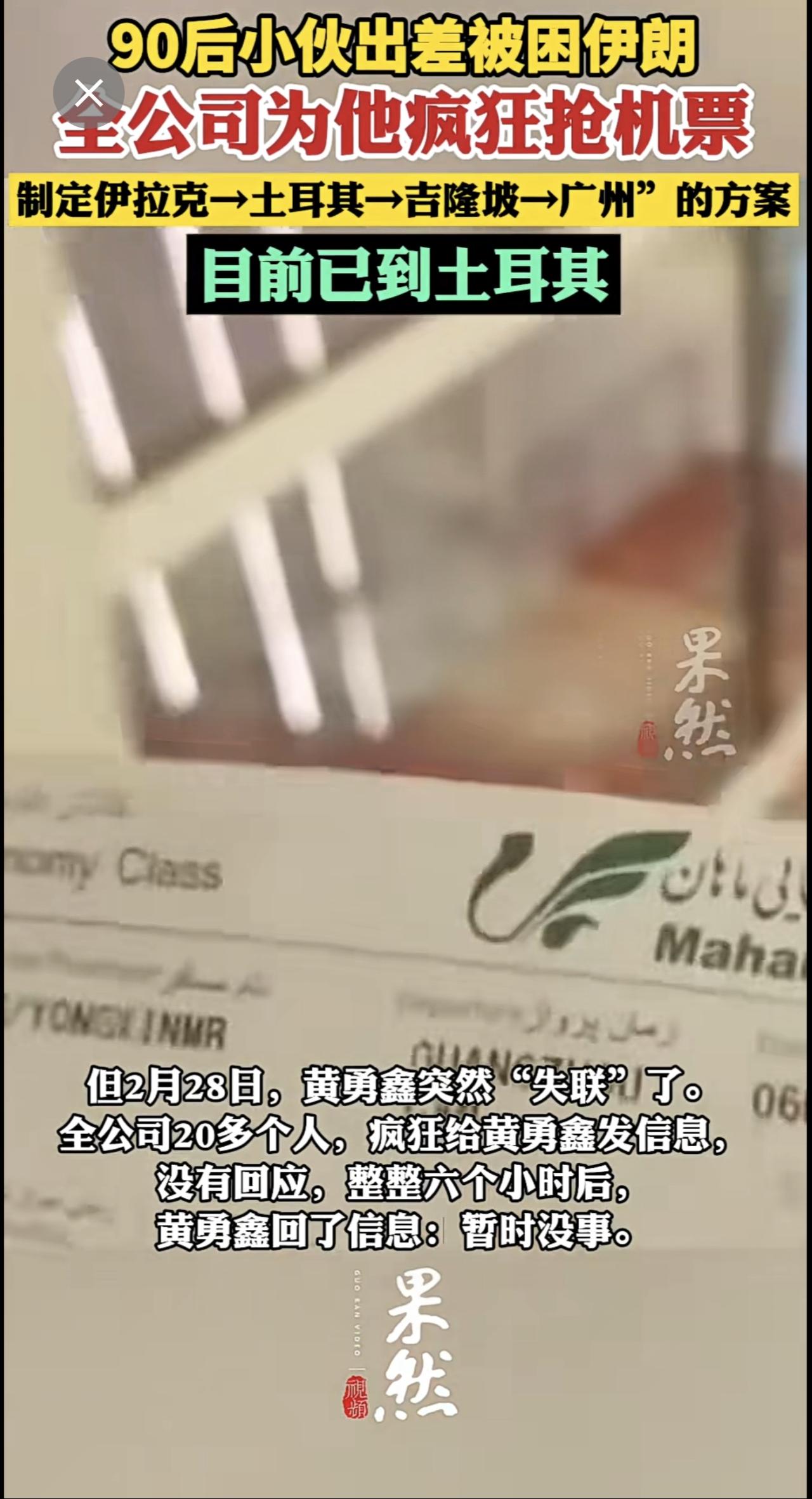 90后小伙被困伊朗,全公司为他疯狂抢机票制定出曲折回国路线,目前已到土耳其。