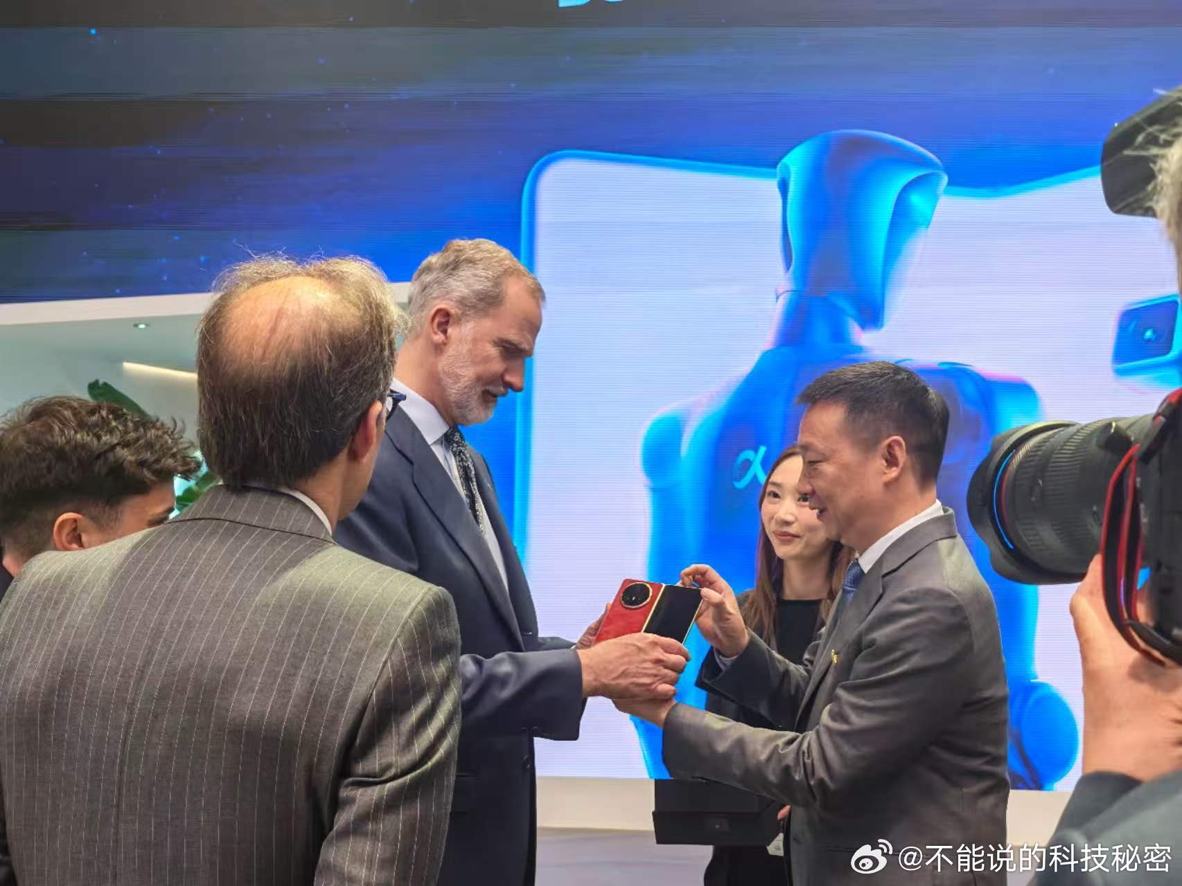 西班牙国王费利佩六世和荣耀机器人握手,对Robot phone影像和AI倍感兴趣,同时还收到了Magic V6的赠礼,对刀片电池赞叹不已,真cool!荣耀MagicV6送给了国王