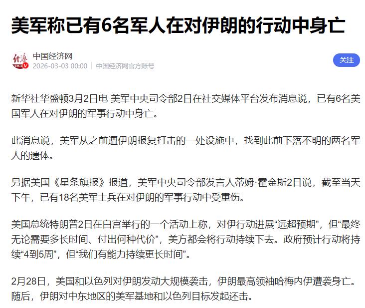 最近有个大事,大家可能都听说了,3月2日的时候,美军中央司令部在网上发了消息,说有6名美国士兵,在打伊朗的行动中死了。 这个消息是新华社从华盛顿发回来的,肯定靠谱,另外美国自己的《星条旗报》也说了,到3月2日下午,还有18名美军受了重伤,伤得挺厉害。 说到这,有人可能会问,这6个美军是怎么死的?其实很简单,其中2个之前在伊朗反击的时候找不到了,后来美军在被伊朗炸过的一个地方,找到了这2个人的遗体,再加上之前已经确定死了的4个,加起来就是6个。 大家肯定也好奇,美国好好的,为啥要打伊朗?最直接的,就是美国和以色列,一直怕伊朗搞核武器。 美国说,伊朗搞的核材料,浓度快到能做武器的程度了,还不让国际上查核武器的机构好好检查,怕威胁到他们。 而且就在打伊朗前两天,美国和伊朗谈崩了,美国提的要求太苛刻,让伊朗拆了核设施、运走核材料,伊朗肯定不愿意,美国就干脆动手了。 还有,以色列在里面帮了不少忙,一直催美国打伊朗。因为以色列一直把伊朗当成最大的敌人,怕伊朗有了核武器和导弹,自己就不安全了,所以天天给美国施压,这次打伊朗,也是美国和以色列一起干的。 更深层的原因,就是美国想在中东说了算。伊朗在中东挺强势,不听美国的话,还敢挑战美国的地位。 而且伊朗守着一个重要的石油通道,全世界三成的石油都从这过,伊朗能把这个通道封了,这就断了美国控制的石油路子,还敢不用美元买石油,美国急了,就想打伊朗,把它打弱,自己好继续在中东当老大。 可能有人会想,美国军事实力那么强,怎么还会死6人、伤18人?其实伊朗也有本事,反击得很狠,不是等着挨打。 伊朗用导弹和无人机打美军,而且美军的基地离伊朗很近,很容易被反击。另外,美军自己也出了差错,有3架战机在附近坠毁了,虽说飞行员没事,但也能看出来,美军这次行动一点都不顺利。 还有个事要说,其他国家都不支持美国打伊朗。北约明确说不参与,英国、法国也说不帮忙,还说美国和以色列这么做不合法。 现在局势很紧张,美国总统特朗普说,打伊朗可能要持续四五个星期,甚至更久,伊朗也不服软,说做好了长期打的准备,不跟美国谈,还要接着反击。 很多人可能会担心,这事跟我们有关系吗?直接影响不大,但间接影响还是有的。 比如那个石油通道被封了,石油不好运,油价可能会涨,我们加油、过日子的成本就可能变高。而且中东乱了,也会影响全世界的经济,毕竟现在各国都联系得很紧密。 现在双方打得越来越凶,没要停的意思,希望他们能早点停火谈判,别再死人了,毕竟战争最后受苦的,还是普通老百姓。